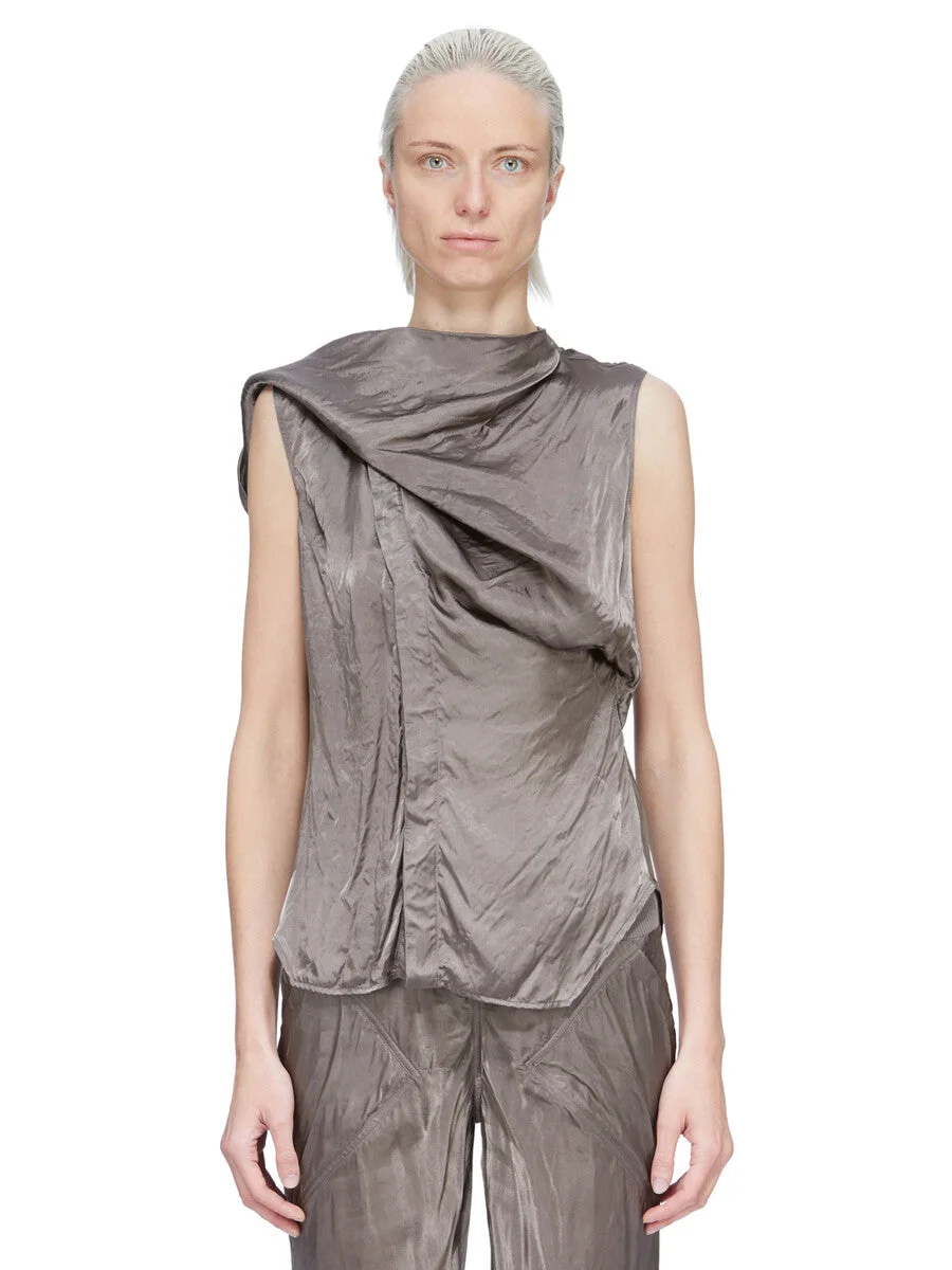 RICK OWENS SS26 TEMPLE SL ISLAND SHIRT IN DUST CUPRO SATIN THIS SL ISLAND SHIRT IS HIP-LENGTH AND SLEEVELESS. IT FEATURES A FRONT OPENING WITH CONCEALED BUTTON CLOSURES THAT VEERS TO THE RIGHT, UNDER THE CHIN, AND INTO A POINT, CREATING A SLIGHT DRAPE AT FRONT AND A SMALL, ROUNDED, FUNNEL NECK AT BACK. IT HAS A BACK YOKE AND A HEMLINE WITH BEVELED SIDE SPLITS. THIS LIGHTWEIGHT AND FLUID CUPRO SATIN HAS A GLOSSY SURFACE, A SOFT HANDFEEL AND WASHED FINISH. THIS FABRIC IS MADE USING CUPRO WHICH IS BIODEGRADABLE AND 100% PLANT BASED. AS IT’S MADE FROM COTTON WASTE, CUPRO HELPS FIND A PURPOSE TO FIBERS THAT WOULD OTHERWISE BE DISCARDED. COLOR: DUST MATERIAL:100% CUPRO BUTTONS 100% BUFFALO HORN MODEL IS 181CM TALL MODEL WEARS SIZE 40