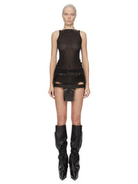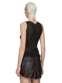 RICK OWENS SS26 TEMPLE SL TOP IN BLACK MINI RIB THIS SL TOP IS HIP LENGTH AND SLEEVELESS. IT FEATURES A STRAIGHT FRONT NECK THAT SCOOPS LOWER AT THE BACK. IT HAS GEOMETRIC SEAM LINES ACROSS THE FRONT AND A SINGLE SEAM DOWN THE CENTRE BACK. THIS VERSION IS TRANSPARENT AND CAN BE WORN LAYERED WITH OTHER GARMENTS IN THE TULLE SECTION OF THIS COLLECTION. THIS LIGHTWEIGHT MINI RIB HAS A TEXTURED SURFACE AND SOFT HANDFEEL. THIS JERSEY IS MADE USING GOTS CERTIFIED ORGANIC COTTON WHICH MEANS THE NATURAL FIBER IS GROWN WITHOUT HARMFUL CHEMICALS, LEAVING OUR SOIL, AIR AND WATER CLEANER FROM CONTAMINATES. WE STRIVE TO KEEP OUR PRODUCTION AS LOCAL AS POSSIBLE. THE FULL MANUFACTURING CYCLE OF THIS PRODUCT, FROM THE MATERIAL KNITTING TO SEWING AND FINISHING, WAS UNDERTAKEN CLOSE TO OUR HOME BASE IN CONCORDIA, ITALY. COLOR: BLACK MATERIAL: 100% COTTON MODEL IS 181CM TALL MODEL WEARS SIZE 40