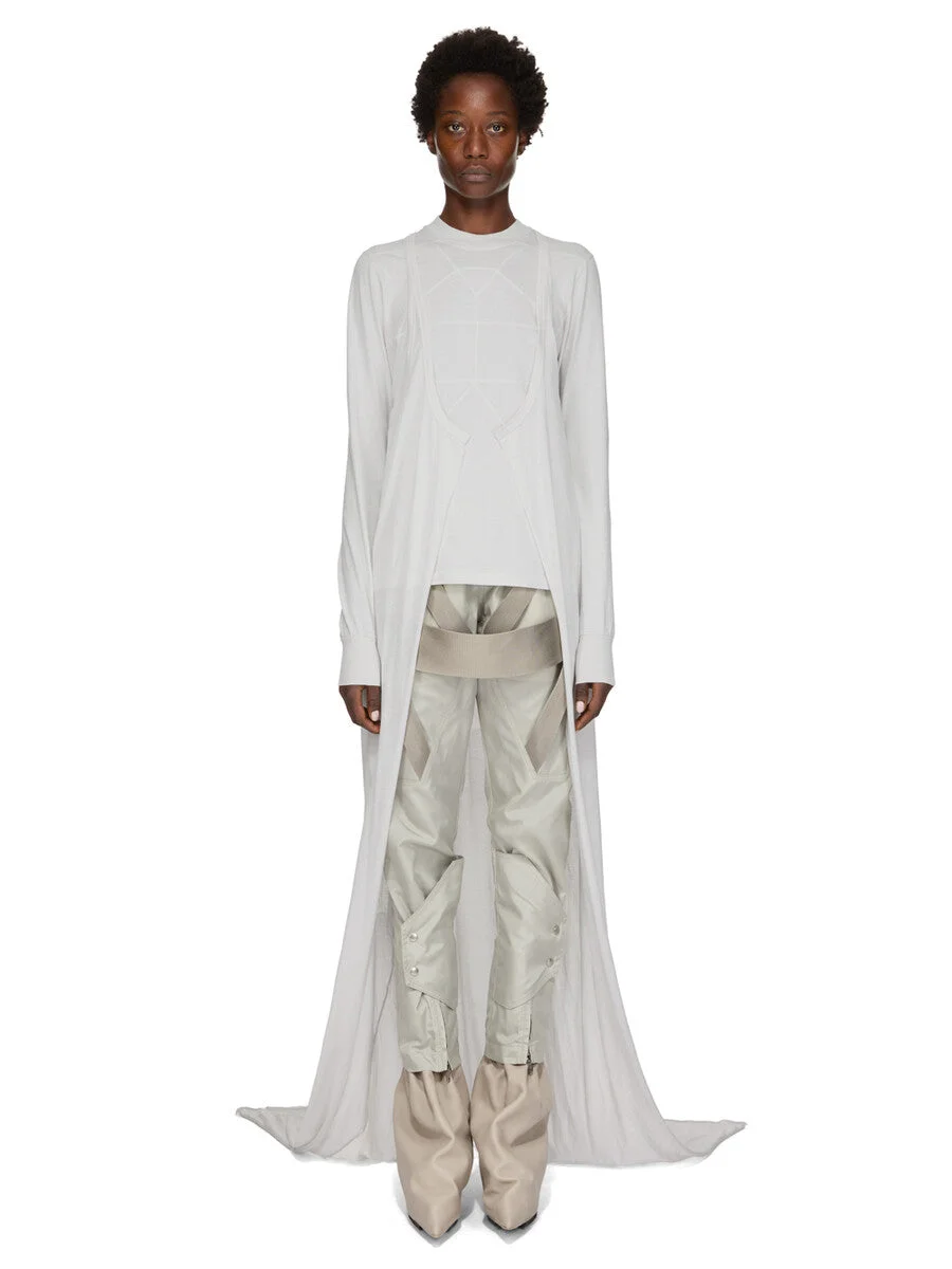 RICK OWENS SS26 TEMPLE SLICED PONY TANK LONG IN MILK WASH COTTON GAUZE JERSEY THIS SLICED PONY TANK LONG IS FLOOR LENGTH. IT HAS A LOW SCOOP FRONT, A SLIGHT RACER BACK AND A RAW CUT HEM. THIS VERSION IS HAND CUT UP THE FRONT REVEALING THE BODY. THIS LIGHTWEIGHT AND AIRY COTTON GAUZE JERSEY IS SEMI TRANSPARENT AND HAVE A SOFT WASHED HAND FEEL. THIS JERSEY IS GARMENT DYED. THIS FABRIC IS MADE USING GOTS CERTIFIED ORGANIC COTTON WHICH MEANS THE NATURAL FIBER IS GROWN WITHOUT HARMFUL CHEMICALS, LEAVING OUR SOIL, AIR AND WATER CLEANER FROM CONTAMINATES COLOR: MILK WASH MATERIAL:100% COTTON MODEL IS 181CM TALL MODEL WEARS SIZE 40