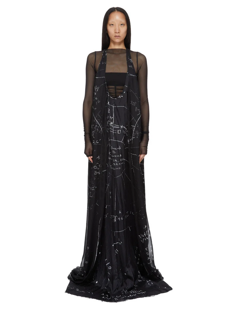 RICK OWENS SS26 TEMPLE SLICED PONY TANK LONG IN BLACK/MILK PRINTED SILK CHIFFON THIS SLICED PONY TANK LONG IS FLOOR LENGTH. IT HAS A LOW SCOOP FRONT, A SLIGHT RACER BACK AND A RAW CUT HEM. THIS VERSION IS HAND CUT UP THE FRONT REVEALING THE BODY. THIS LIGHTWEIGHT AND SEMI-TRANSPARENT SILK CHIFFON IS FLUID WITH A MATTE SURFACE AND DRY HANDFEEL. IT IS WOVEN AND DIGITALLY PRINTED WITH OUR SEASONAL ASTRO MOTIF IN THE COMO REGION OF ITALY KNOWN FOR ITS HERITAGE OF SILK PRODUCTION. COLOR: BLACK/MILK MATERIAL:100% SILK MODEL IS 181CM TALL MODEL WEARS SIZE 40