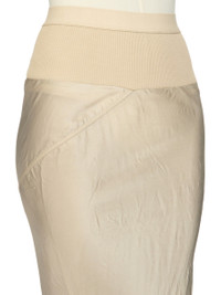 RICK OWENS SS26 TEMPLE SLIM LONG CODA IN SAND CUPRO SATIN THIS SLIM LONG CODA SKIRT IS FLOOR LENGTH WITH A WIDE RIBBING AND ELASTICIZED WAISTBAND. IT FALLS IN A SLIM COLUMN TO THE FLOOR AND FEATURES A DIAGONAL BIAS CUT SEAM WITH DRAPED INSERT AT MID BACK. THIS LIGHTWEIGHT AND FLUID CUPRO SATIN HAS A GLOSSY SURFACE, A SOFT HANDFEEL AND WASHED FINISH. THIS FABRIC IS MADE USING CUPRO WHICH IS BIODEGRADABLE AND 100% PLANT BASED. AS IT’S MADE FROM COTTON WASTE, CUPRO HELPS FIND A PURPOSE TO FIBERS THAT WOULD OTHERWISE BE DISCARDED. COLOR: SAND MATERIAL:100% CUPRO BAND 65% COTTON + 35% NYLON MODEL IS 181CM TALL MODEL WEARS SIZE 40