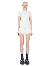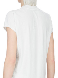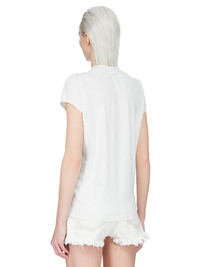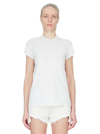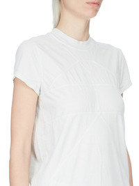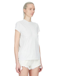 RICK OWENS SS26 TEMPLE SMALL LEVEL T IN MILK WASH MEDIUM WEIGHT COTTON JERSEY THIS SMALL LEVEL T IS HIP LENGTH WITH A SEMI-FITTED CUT, SHORT SLEEVES AND A RIBBED CREW NECK. IT FEATURES SIGNATURE FRONT LEVEL SHOULDER SEAMS AND A CENTRE BACK SEAM. THIS MEDIUMWEIGHT COTTON JERSEY HAS A COMPACT AND DRY HANDFEEL. THIS JERSEY IS GARMENT DYED. THIS FABRIC IS MADE USING GOTS CERTIFIED ORGANIC COTTON WHICH MEANS THE NATURAL FIBER IS GROWN WITHOUT HARMFUL CHEMICALS, LEAVING OUR SOIL, AIR AND WATER CLEANER FROM CONTAMINATES. COLOR: MILK WASH MATERIAL: 100% COTTON MODEL IS 181CM TALL MODEL WEARS SIZE 40