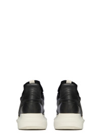 RICK OWENS SS26 TEMPLE GETH RUNNER IN BLACK/BLACK/MILK LINUS LAMB LEATHER THIS GETH RUNNER IS UNDER ANKLE HEIGHT. THEY HAVE A CUSHIONED BACK RISING TO A POINT, AN INTEGRATED ANGLED SIDE STRIPE, A BEVELED EXTENDED TONGUE WITH WEBBING DETAIL, AND CONTRAST LACES. IT FEATURES A THICK GEOMETRIC SOLE WITH AN ANGLED, EXTENDED HEEL. THEY ALSO HAVE AN INTERNAL STRUCTURE THAT ALLOW THE SHOES TO BE WORN WITH OR WITHOUT LACES. THIS MEDIUMWEIGHT ALBINO LAMB LEATHER HAS A NATURAL AND WAXY HANDFEEL. TANNED IN THE NAPLES AREA OF ITALY, THIS LEATHER IS MADE ON A METAL FREE TANNED WHITE BASE, TUMBLED IN ORDER TO BRING OUT THE NATURAL GRAIN TEXTURE OF THE LEATHER AND FINISHED WITH NATURAL WAX BY HAND TO ACHIEVE THE IRREGULAR ALBINO COLORATION. BECAUSE THIS SKIN IS NAKED, NOT FINISHED USING ANY PIGMENTS COVERING THE SKIN, NATURAL MARKINGS AND SHADINGS ARE VISIBLE WHICH MAKES EACH SKIN AND PRODUCT UNIQUE. COLOR: BLACK/BLACK/MILK MATERIAL:UPPER 100% LAMB LEATHER LINING 100% LAMB LEATHER INSOLE 100% CALF LEATHER SOLE 100% E.V.A SOLE AT HIGHEST POINT 6CM