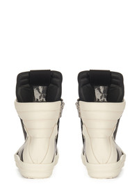 RICK OWENS SS26 TEMPLE GEOBASKET IN BLACK/MILK/MILK FULL GRAIN COW LEATHER THESE GEOBASKETS ARE ABOVE-ANKLE HEIGHT. THEY FEATURE AN EXTENDED TONGUE WITH WEBBING TAB, SIGNATURE GEOMETRIC PANELS AND A PADDED BACK COUNTER WITH LINES OF TOPSTITCHING. THEY HAVE CONTRAST LACES, A ZIPPER ON THE INSIDE ANKLE FOR EASY FASTENING AND SHARK-TOOTHED BUMPER SOLE. THIS MEDIUMWEIGHT FULL GRAIN COW LEATHER HAS A FLAT AND MATTE SURFACE FINISH AND IS SPECIFICALLY TANNED FOR SHOES WITH AN ABRASION-RESISTANT FINISH. THIS TANNERY IS LWG CERTIFIED WITH A BRONZE RATING. COLOR: BLACK/MILK/MILK MATERIAL: UPPER 100% COW LEATHER LINING 100% CALF LEATHER INSOLE 100% CALF LEATHER SOLE 100% THERMOPLASTIC RUBBER SOLE HEIGHT 3.5CM