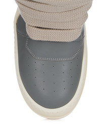 RICK OWENS FW25 CONCORDIANS JUMBOLACE GEOBASKET IN WASHED INDIGO/MILK/MILK FULL GRAIN COW LEATHER THESE JUMBOLACE GEOBASKETS ARE ABOVE-ANKLE HEIGHT. THEY FEATURE AN EXTENDED TONGUE WITH WEBBING TAB, SIGNATURE GEOMETRIC PANELS AND A PADDED BACK COUNTER WITH LINES OF TOPSTITCHING. THEY HAVE JUMBO LACES, A ZIPPER ON THE INSIDE ANKLE FOR EASY FASTENING AND SHARK-TOOTHED BUMPER SOLES THIS MEDIUMWEIGHT FULL GRAIN COW LEATHER HAS A FLAT AND MATTE SURFACE FINISH AND IS SPECIFICALLY TANNED FOR SHOES WITH AN ABRASION-RESISTANT FINISH THIS TANNERY IS LWG CERTIFIED WITH A BRONZE RATING COLOR: WASHED INDIGO/MILK/MILK MATERIAL: UPPER 100% COW LEATHER LINING 100% CALF LEATHER INSOLE 100% CALF LEATHER SOLE 100% THERMOPLASTIC RUBBER SOLE HEIGHT 3.5CM