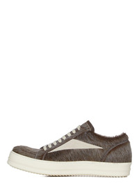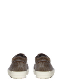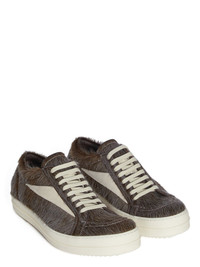 RICK OWENS FW25 CONCORDIANS RUNWAY VINTAGE SNEAKS IN INDIGO/MILK MELANGE UNSHAVED COW LEATHER AND SUEDE LEATHER THESE VINTAGE SNEAKS ARE UNDER-ANKLE HEIGHT AND HAVE EIGHT EYELETS WITH LACES, TOE CAPS AND SHARK-TOOTHED BUMPER SOLES. THEY FEATURE A TRIANGULAR LEATHER APPLIQUE ON THE SIDE FOOT, A PADDED ANKLE AND CONTRAST STITCHING THIS HEAVYWEIGHT LEATHER IS A HAIR-ON COWHIDE WITH NATURAL LENGTH COARSE HAIR. IT HAS BEEN TREATED WITH A CORROSION TREATMENT WHICH CREATES AN IRREGULAR INDIGO AND BROWN MELANGE COLORATION THIS LEATHER IS TANNED IN THE VENETO AREA OF ITALY BY A TANNERY SPECIALIZED IN HAIR-ON COW LEATHER. BECAUSE THE HAIR IS NATURAL THERE CAN BE INCONSISTENCY IN THE LENGTH DIRECTION, TEXTURE AND COLOR THIS TANNERY IS LWG CERTIFIED WITH A SILVER RATING COLOR: INDIGO/MILK MATERIAL: UPPER 100% COW REAL FUR LINING 100% CALF LEATHER INSOLE 100% CALF LEATHER SOLE AT HIGHEST POINT 6CM