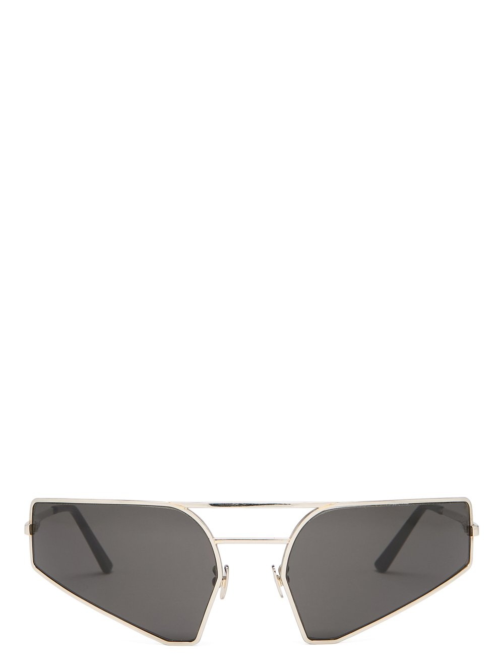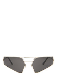 RICK OWENS PRONG SUNGLASSES THESE PRONG SUNGLASSES DRAW THEIR SHAPE FROM RICK OWENS’ SCULPTURAL PRONG FURNITURE. THEY FEATURE A DISTINCTIVE ANGULAR LENS FRAMED IN SLIM, LIGHTWEIGHT STAINLESS STEEL, CHROME NOSE PADS AND FLEXIBLE TEMPLE HINGES COLOR: SILVER, BLACK FRAME: 100% STAINLESS STEEL LENSES: 100% NYLON