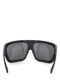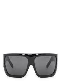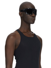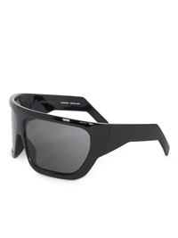 RICK OWENS DAVIS SUNGLASSES IN SHINY BLACK THESE DAVIS SUNGLASSES ARE LARGE WRAP AROUND FRAMES WITH GEOMETRIC CURVED LENSES. THEY HAVE THICK ANGLED ARMS AND RICK OWENS LOGO ON INSIDE RIGHT - COLOR: SHINY BLACK TEMPLE/BLACK LENS - MATERIAL: FRAME 100% GRILAMID - LENSES: 100% NYLON -NOT SUITABLE FOR CONVERSION INTO PRESCRIPTION GLASSES