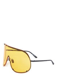 RICK OWENS SHIELD SUNGLASSES THESE SHIELD SUNGLASSES FEATURE A SURGICAL STAINLESS STEEL FRAME, A SINGLE VOLUMINOUS CURVED CORRESPONDING LENS SECURED WITH SCREWS AND A RUBBER NOSE PAD. THEY HAVE SLIM METAL ARMS WITH THE RICK OWENS LOGO ON THE INSIDE RIGHT TEMPLE. NOT SUITABLE FOR CONVERSION INTO PRESCRIPTION GLASSES - COLOR: BLACK, YELLOW - FRAME: 100% STAINLESS STEEL - LENSES: 100% NYLON - MEASURES: 20CM X 8CM X 6CM -NOT SUITABLE FOR CONVERSION INTO PRESCRIPTION GLASSES