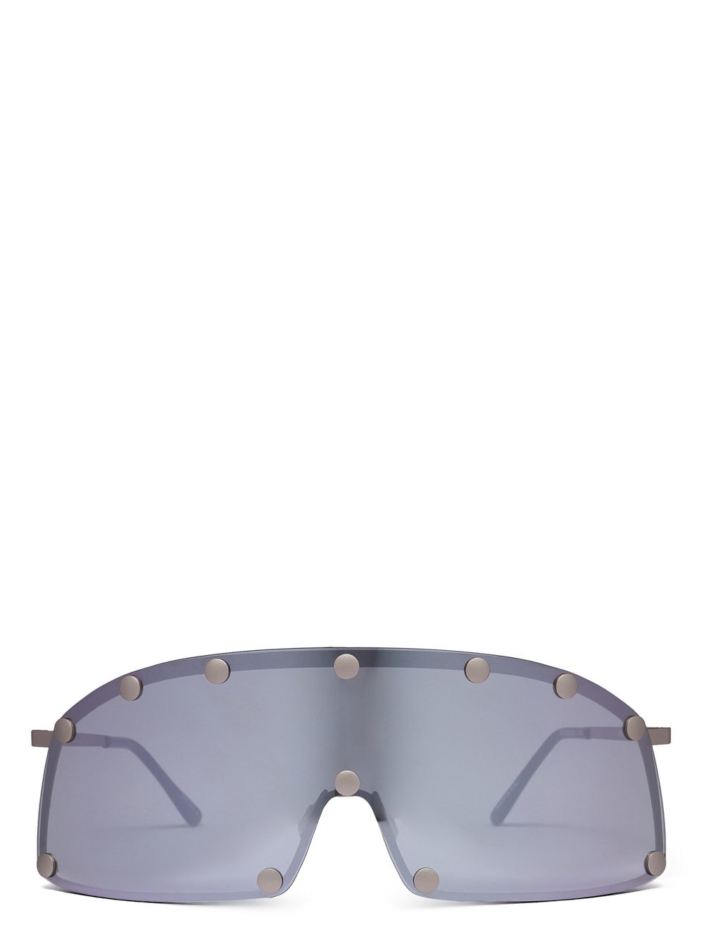 RICK OWENS SHIELDING SUNGLASSES THESE SUNGLASSES FEATURE A SILVER SURGICAL STAINLESS STEEL FRAME, A STRAIGHT-BOTTOMED BLACK LENSE AND A RUBBER NOSE PAD COLOR: SILVER TEMPLE/SILVER LENS FRAME: 100% STAINLESS STEEL LENSES: 100% NYLON NOT SUITABLE FOR CONVERSION INTO PRESCRIPTION GLASSES