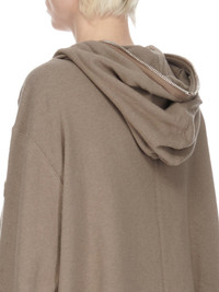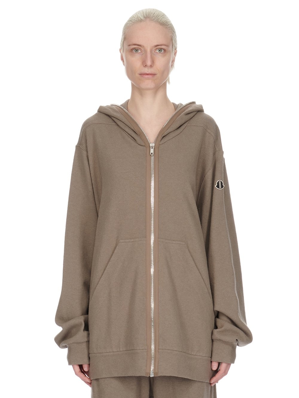 MONCLER + RICK OWENS FW24 JUMBO GIMP HOODIE IN DUST DOUBLE BRUSHED JERSEY THIS JUMBO GIMP HOODIE IS BELOW HIP LENGTH WITH LONG SLEEVES AND AN OVERSIZE FIT. IT HAS A FRONT ZIPPER CLOSURE WITH EXPOSED ZIPPER TAPE THAT RUNS FROM THE HEM ALL THE WAY UP THROUGH THE HOOD, ALLOWING IT TO BE ZIPPERED COMPLETELY CLOSED OVER THE FACE. IT HAS TWO SIDE FRONT POCKETS, RIBBED CUFFS AND HEM, AND A SINGLE SEAM RUNNING DOWN THE CENTRE BACK SPINE. IT HAS THE MONCLER + RICK OWENS EMBROIDERED LOGO PATCH ON THE UPPER LEFT ARM THIS MEDIUMWEIGHT COTTON JERSEY HAS A SOFT AND WARM HAND FEEL WITH A BRUSHED SURFACE. THIS JERSEY IS MADE USING CERTIFIED ORGANIC COTTON. - COLOR: DUST - MATERIAL: 100% COTTON - MALE MODEL IS 189 CM TALL, FEMALE MODEL IS 181 CM TALL - MODELS ARE WEARING SIZE M