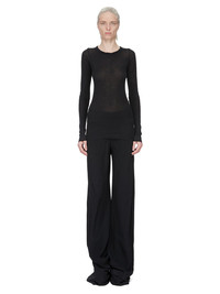 RICK OWENS FOREVER RIB LS T IN MINI RIB JERSEY THIS RIB LS T IS BELOW HIP LENGTH WITH A SLIM FIT AND LONG SLEEVES. IT HAS A RIBBED ROUND NECK, RAW CUT HEM AND CUFFS. IT FEATURES THE SIGNATURE SINGLE SEAM RUNNING DOWN CENTRE BACK SPINE. THIS LIGHTWEIGHT MINI RIB JERSEY HAS A TEXTURED SURFACE AND SOFT HANDFEEL. THIS JERSEY IS MADE USING GOTS CERTIFIED ORGANIC COTTON WHICH MEANS THE NATURAL FIBER IS GROWN WITHOUT HARMFUL CHEMICALS, LEAVING OUR SOIL, AIR AND WATER CLEANER FROM CONTAMINATES. WE STRIVE TO KEEP OUR PRODUCTION AS LOCAL AS POSSIBLE. THE FULL MANUFACTURING CYCLE OF THIS PRODUCT, FROM THE MATERIAL KNITTING TO SEWING AND FINISHING, WAS UNDERTAKEN CLOSE TO OUR HOME BASE IN CONCORDIA, ITALY. FLAGSHIP STORES AND ONLINE ITEM. COLOR: BLACK MATERIAL: 100% COTTON MODEL IS WEARING SIZE 40 MODEL IS 181 CM TALL