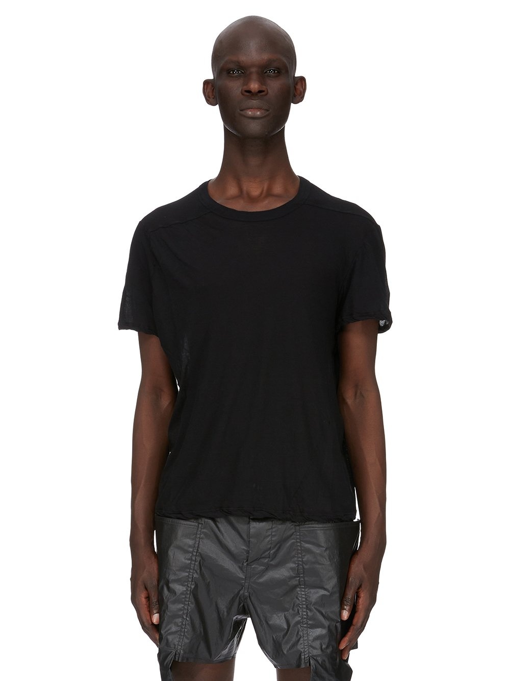 RICK OWENS FW25 CONCORDIANS SHORT LEVEL T IN BLACK UNSTABLE COTTON THIS SHORT LEVEL T IS ABOVE HIP LENGTH WITH SHORT SLEEVES AND A RIBBED CREW NECK. IT FEATURES SIGNATURE FRONT LEVEL SHOULDER SEAMS AND SINGLE SEAM RUNNING DOWN THE CENTRE BACK SPINE THIS LIGHTWEIGHT COTTON JERSEY IS SEMI-TRANSPARENT WITH A SOFT HANDFEEL THIS JERSEY IS MADE USING GOTS CERTIFIED ORGANIC COTTON WHICH MEANS THE NATURAL FIBER IS GROWN WITHOUT HARMFUL CHEMICALS, LEAVING OUR SOIL, AIR AND WATER CLEANER FROM CONTAMINATES WE STRIVE TO KEEP OUR PRODUCTION AS LOCAL AS POSSIBLE. THE FULL MANUFACTURING CYCLE OF THIS PRODUCT, FROM THE MATERIAL KNITTING TO SEWING AND FINISHING, WAS UNDERTAKEN CLOSE TO OUR HOME BASE IN CONCORDIA, ITALY COLOR: BLACK MATERIAL: 100% COTTON MODEL IS 189CM TALL MODEL WEARS SIZE S