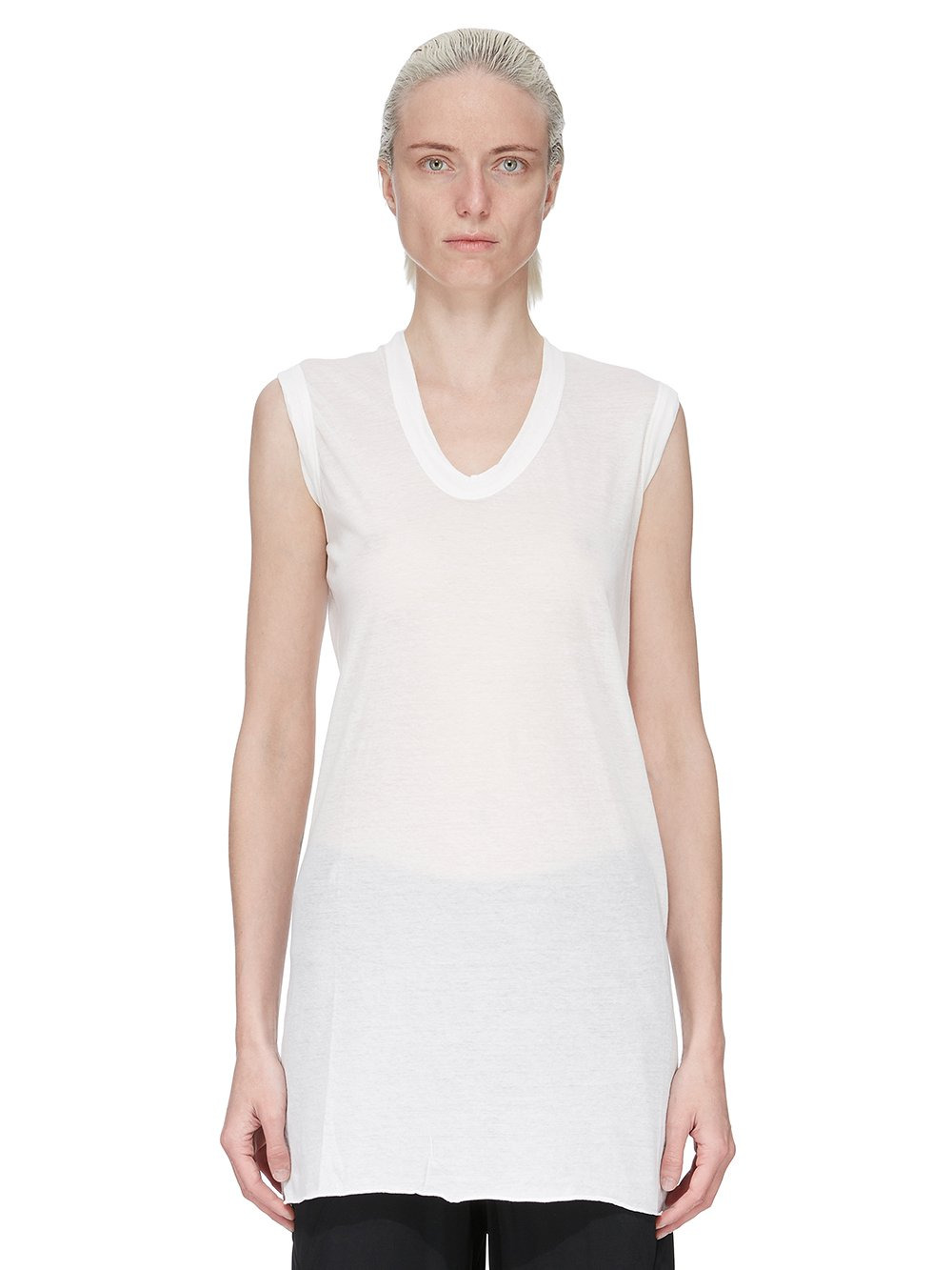 RICK OWENS FOREVER BASIC SL T IN MILK UNSTABLE COTTON THIS BASIC SL T IS BELOW HIP LENGTH AND SLEEVELESS. IT HAS A RIBBED ROUND NECK, RAW CUT HEM AND REINFORCED RAW SHOULDERS. IT FEATURES THE SIGNATURE SINGLE SEAM RUNNING DOWN THE CENTRE BACK SPINE THIS LIGHTWEIGHT COTTON JERSEY IS SEMI-TRANSPARENT WITH A SOFT HANDFEEL. THIS JERSEY IS MADE USING GOTS CERTIFIED ORGANIC COTTON WHICH MEANS THE NATURAL FIBER IS GROWN WITHOUT HARMFUL CHEMICALS, LEAVING OUR SOIL, AIR AND WATER CLEANER FROM CONTAMINATES WE STRIVE TO KEEP OUR PRODUCTION AS LOCAL AS POSSIBLE. THE FULL MANUFACTURING CYCLE OF THIS PRODUCT, FROM THE MATERIAL KNITTING TO SEWING AND FINISHING, WAS UNDERTAKEN CLOSE TO OUR HOME BASE IN CONCORDIA, ITALY. - COLOR:WHITE - MATERIAL: 100% COTTON - MODEL IS WEARING SIZE 40 - MODEL IS 181 CM TALL