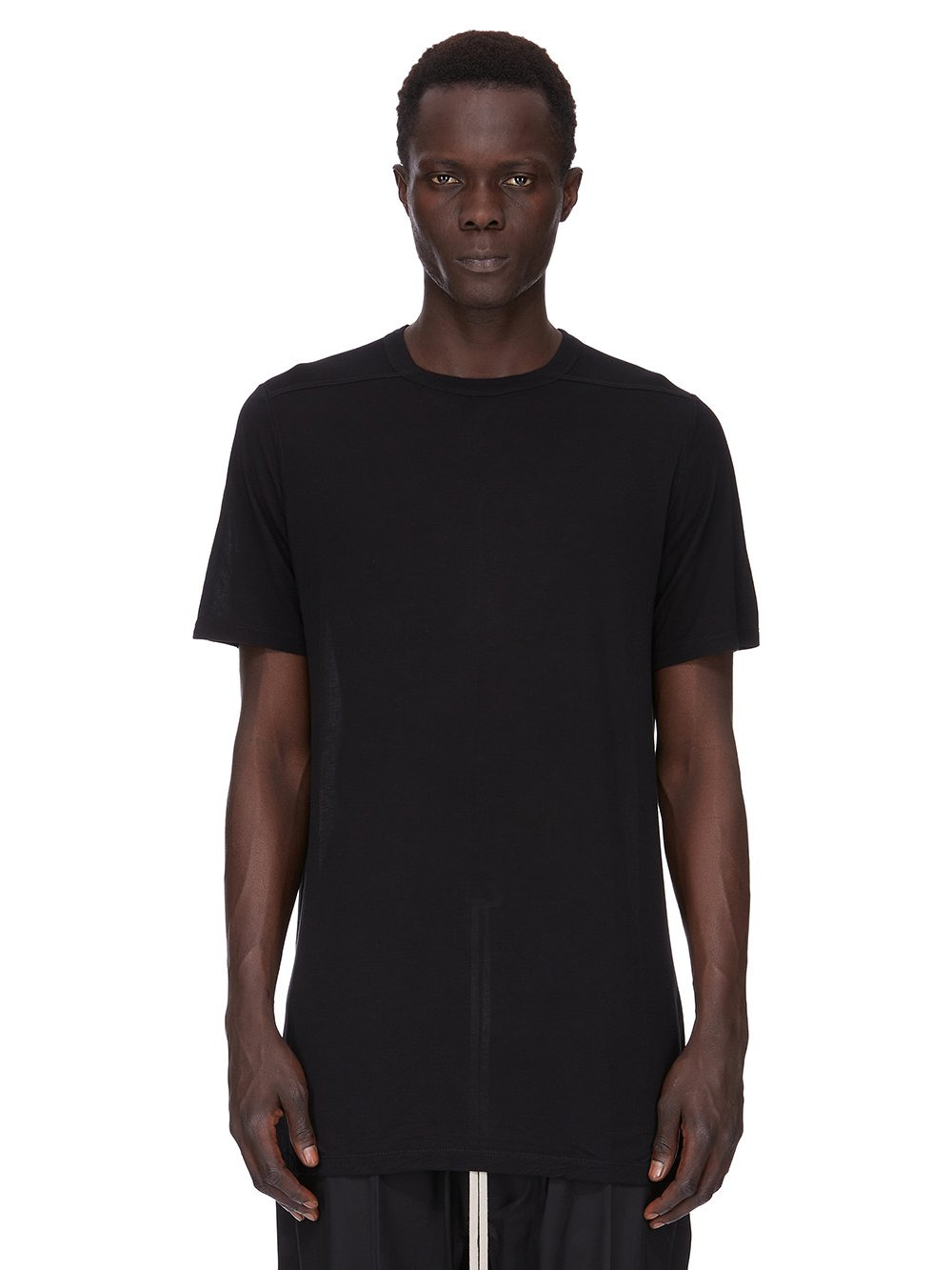 RICK OWENS FOREVER LEVEL T IN BLACK VISCOSE SILK JERSEY THIS LEVEL T IS BELOW HIP LENGTH WITH SHORT SLEEVES, AND A RIBBED CREW-NECK. IT FEATURES SIGNATURE FRONT LEVEL SHOULDER SEAMS AND A CENTRE BACK SEAM THIS LIGHTWEIGHT VISCOSE AND SILK JERSEY HAS A SOFT AND DRAPEY HANDFEEL. THIS JERSEY IS MADE FROM FSC® CERTIFIED VISCOSE WHICH ENSURES THAT THE FIBERS ARE PRODUCED FROM RESPONSIBLY MANAGED SOURCES AND NO DEFORESTATION OCCURS WE STRIVE TO KEEP OUR PRODUCTION AS LOCAL AS POSSIBLE. THE FULL MANUFACTURING CYCLE OF THIS PRODUCT, FROM THE MATERIAL KNITTING TO SEWING AND FINISHING, WAS UNDERTAKEN CLOSE TO OUR HOME BASE IN CONCORDIA, ITALY. - COLOR:BLACK - MATERIAL: 88% VISCOSE + 12% SILK - MODEL IS WEARING SIZE S - MODEL IS 189 CM TALL