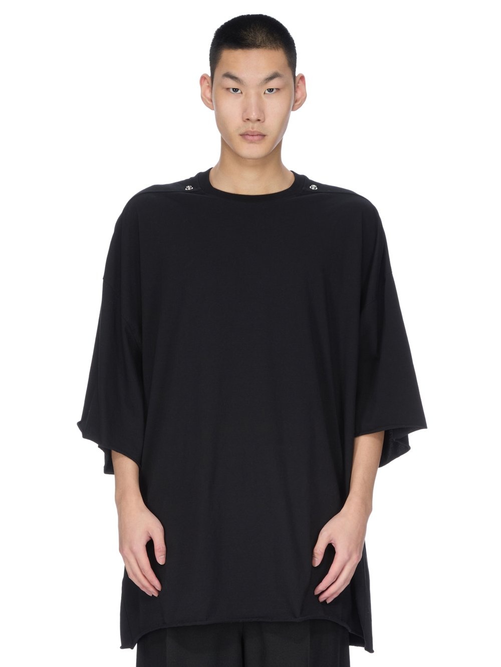 RICK OWENS FW25 CONCORDIANS TOMMY T IN BLACK CLASSIC COTTON JERSEY THIS TOMMY T IS BELOW HIP LENGTH WITH A JUMBO OVERSIZED FIT. IT HAS WIDE SHORT SLEEVES WITH A DROPPED ARMHOLE AND A RIBBED CREWNECK. IT FEATURES SIGNATURE FRONT LEVEL SHOULDER SEAMS. THIS VERSION FEATURES STUD DETAIL ON SHOULDERS THIS MEDIUMWEIGHT CLASSIC COTTON JERSEY IS COMPACT WITH A DRY HANDFEEL THIS JERSEY IS MADE USING GOTS CERTIFIED ORGANIC COTTON WHICH MEANS THE NATURAL FIBER IS GROWN WITHOUT HARMFUL CHEMICALS, LEAVING OUR SOIL, AIR AND WATER CLEANER FROM CONTAMINATES WE STRIVE TO KEEP OUR PRODUCTION AS LOCAL AS POSSIBLE. THE FULL MANUFACTURING CYCLE OF THIS PRODUCT, FROM THE MATERIAL KNITTING TO SEWING AND FINISHING, WAS UNDERTAKEN CLOSE TO OUR HOME BASE IN CONCORDIA, ITALY COLOR: BLACK MATERIAL: 100% COTTON MODEL IS 189CM TALL ITEM IS AVAILABLE IN ONE SIZE