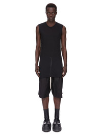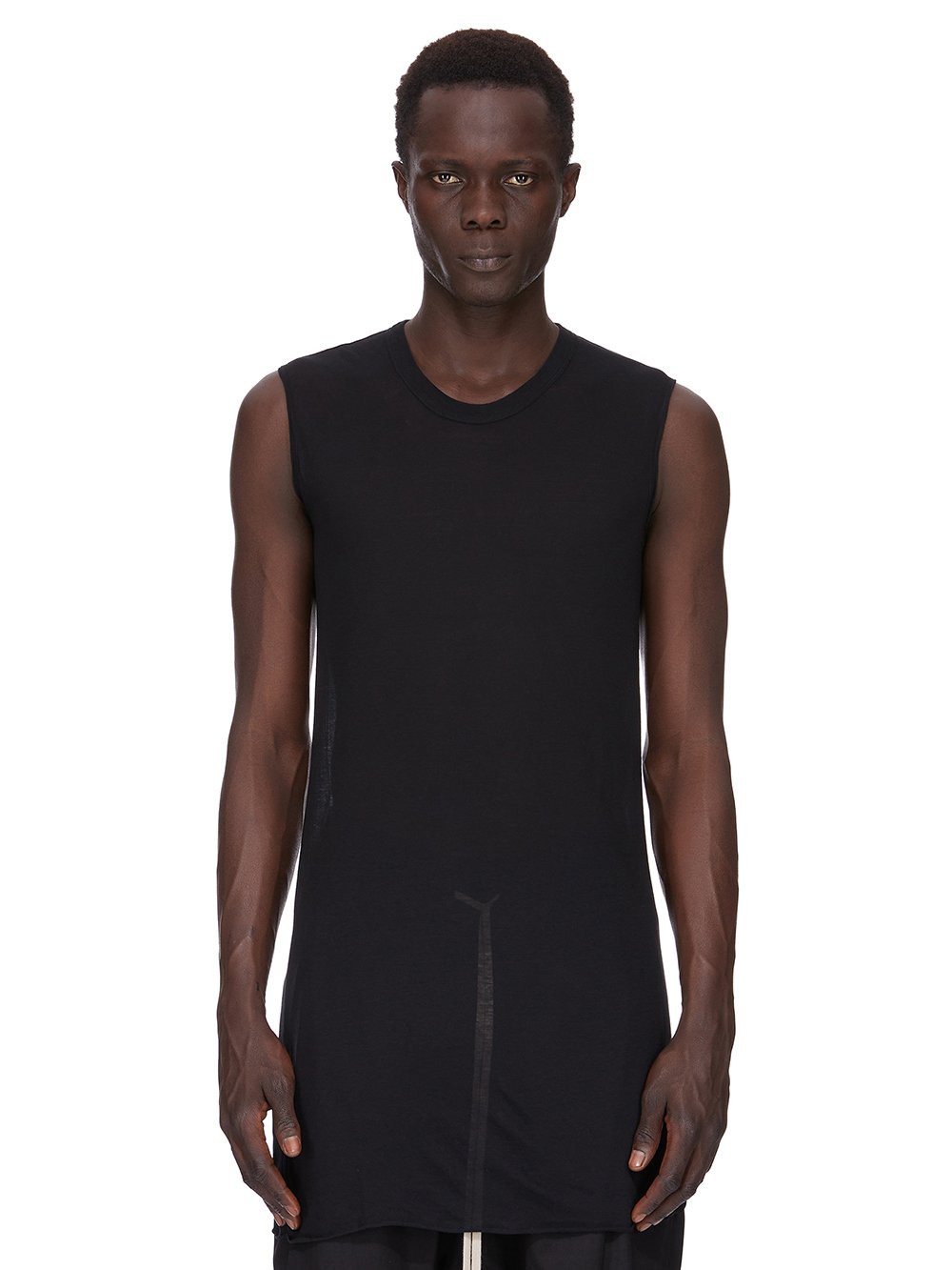RICK OWENS FOREVER BASIC SL T IN BLACK UNSTABLE COTTON THIS BASIC SL T IS BELOW HIP LENGTH AND SLEEVELESS. IT HAS A RIBBED ROUND NECK, RAW CUT HEM AND REINFORCED RAW SHOULDERS. IT FEATURES THE SIGNATURE SINGLE SEAM RUNNING DOWN THE CENTRE BACK SPINE THIS LIGHTWEIGHT COTTON JERSEY IS SEMI-TRANSPARENT WITH A SOFT HANDFEEL. THIS JERSEY IS MADE USING GOTS CERTIFIED ORGANIC COTTON WHICH MEANS THE NATURAL FIBER IS GROWN WITHOUT HARMFUL CHEMICALS, LEAVING OUR SOIL, AIR AND WATER CLEANER FROM CONTAMINATES WE STRIVE TO KEEP OUR PRODUCTION AS LOCAL AS POSSIBLE. THE FULL MANUFACTURING CYCLE OF THIS PRODUCT, FROM THE MATERIAL KNITTING TO SEWING AND FINISHING, WAS UNDERTAKEN CLOSE TO OUR HOME BASE IN CONCORDIA, ITALY. - COLOR:BLACK - MATERIAL: 100% COTTON - MODEL IS WEARING SIZE S - MODEL IS 189 CM TALL