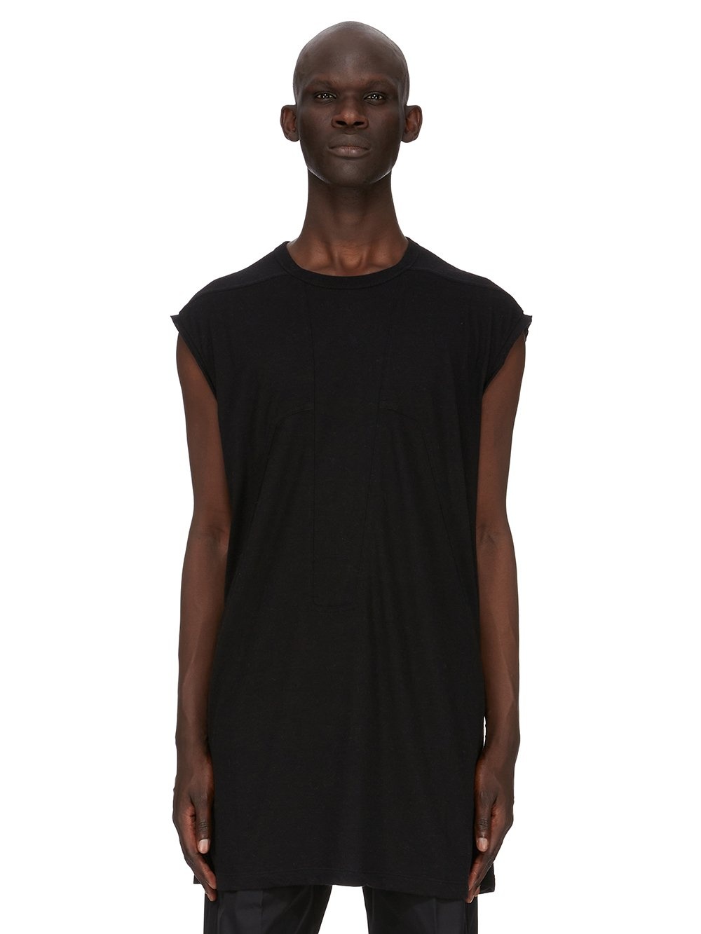 RICK OWENS FW25 CONCORDIANS SPLINTERED TARP T IN BLACK RAININO JERSEY THIS TARP T IS BELOW HIP LENGTH WITH A LOOSE FIT. IT IS SLEEVELESS WITH WIDE SHOULDERS AND A RIBBED CREW NECK. IT HAS SIGNATURE FRONT LEVEL SHOULDER SEAMS AND SINGLE SEAM RUNNING DOWN THE CENTRE BACK SPINE THIS MEDIUMWEIGHT AND FLUID VISCOSE AND WOOL BLEND JERSEY HAS A SOFT, WARM HANDFEEL AND A SLIGHTLY HAIRY SURFACE TEXTURE WE STRIVE TO KEEP OUR PRODUCTION AS LOCAL AS POSSIBLE. THE FULL MANUFACTURING CYCLE OF THIS PRODUCT, FROM THE MATERIAL KNITTING TO SEWING AND FINISHING, WAS UNDERTAKEN CLOSE TO OUR HOME BASE IN CONCORDIA, ITALY THIS JERSEY IS MADE FROM FSC® CERTIFIED VISCOSE AND RWS CERTIFIED WOOL COLOR: BLACK MATERIAL: 30% VISCOSE + 30% NYLON + 20% ANGORA + 20% WOOL MODEL IS 189CM TALL MODEL WEARS SIZE S