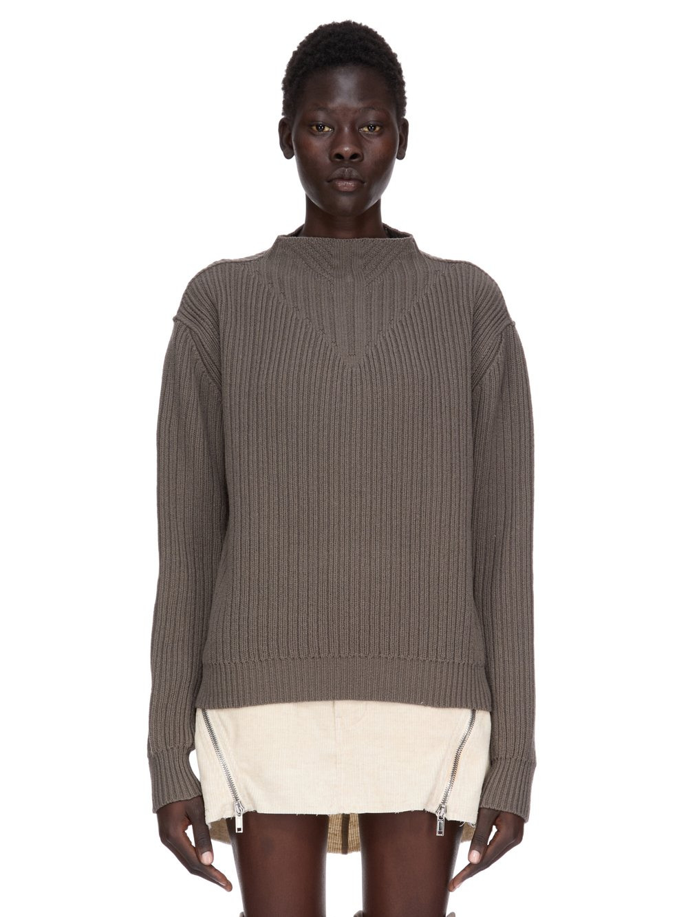 RICK OWENS FW25 CONCORDIANS AL PULL IN DUST HEAVY WOOL KNIT THIS AL PULL IS ABOVE HIP LENGTH WITH LONG SLEEVES. IT HAS A ROUNDED SHAPE, RIBBED ROUND NECK WITH V CUT OUT AND RIBBED CUFFS AND HEM. IT FEATURES THE FRONT LEVEL SHOULDER LINE AND A KNIT CHANNEL RUNNING DOWN THE CENTRE BACK SPINE THIS A HEAVY WOOL FISHERMAN KNIT COLOR: DUST MATERIAL: 100% NEW WOOL MODEL IS 181CM TALL MODEL WEARS SIZE S