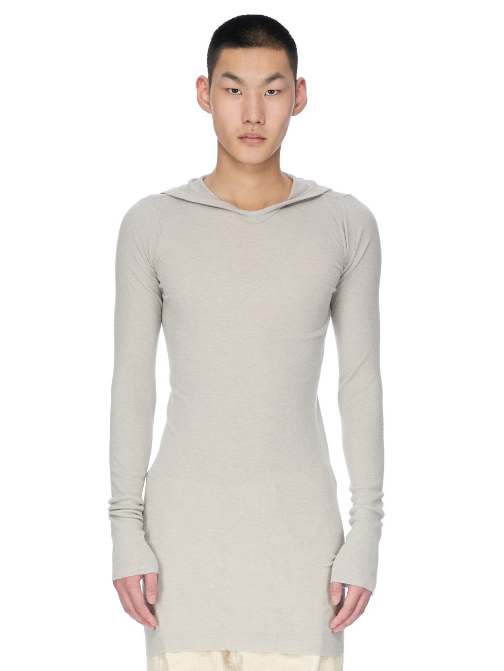 RICK OWENS FW25 CONCORDIANS HOODED RIB LS T IN PEARL RAININO RIB JERSEY THIS HOODED RIB LS T IS BELOW HIP LENGTH WITH A SLIM FIT AND LONG SLEEVES AND A HOOD. IT HAS A RIBBED NECKLINE, RAW CUT HEM AND CUFFS, AND FEATURES THE SIGNATURE SINGLE SEAM RUNNING DOWN CENTRE BACK SPINE THIS MEDIUMWEIGHT AND FLUID VISCOSE AND WOOL BLEND RIB JERSEY HAS A SOFT, WARM HANDFEEL AND A SLIGHTLY HAIRY SURFACE TEXTURE WE STRIVE TO KEEP OUR PRODUCTION AS LOCAL AS POSSIBLE. THE FULL MANUFACTURING CYCLE OF THIS PRODUCT, FROM THE MATERIAL KNITTING TO SEWING AND FINISHING, WAS UNDERTAKEN CLOSE TO OUR HOME BASE IN CONCORDIA, ITALY THIS JERSEY IS MADE FROM FSC® CERTIFIED VISCOSE AND RWS CERTIFIED WOOL COLOR: PEARL MATERIAL: 30% VISCOSE + 30% NYLON + 20% ANGORA + 20% WOOL MODEL IS 189CM TALL MODEL WEARS SIZE S