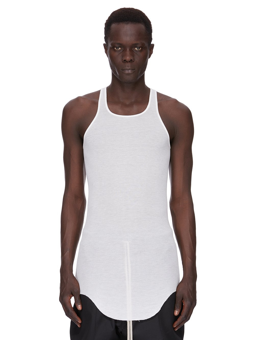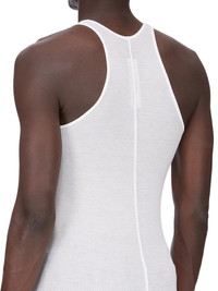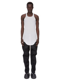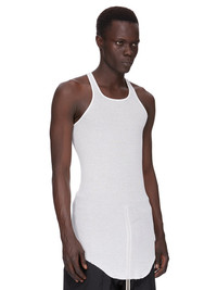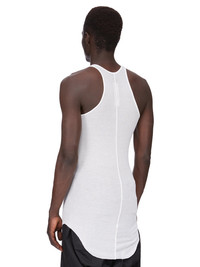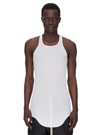 RICK OWENS FOREVER BASIC RIB TANK IN MILK VISCOSE SILK RIB JERSEY THIS BASIC RIB TANK IS HIP LENGTH WITH A ROUNDED RAW CUT HEM THAT DIPS IN FRONT AND BACK. IT HAS A ROUND NECKLINE AND THIN SHOULDER STRAPS THAT FLOW INTO A SLIGHT RACER BACK. IT FEATURES THE SIGNATURE SINGLE SEAM RUNNING DOWN THE CENTRE BACK SPINE THIS LIGHTWEIGHT VISCOSE AND SILK RIB JERSEY HAS A DISTINCT RIB PATTERN AND SOFT HANDFEEL. THIS JERSEY IS MADE FROM FSC® CERTIFIED VISCOSE WHICH ENSURES THAT THE FIBERS ARE PRODUCED FROM RESPONSIBLY MANAGED SOURCES AND NO DEFORESTATION OCCURS WE STRIVE TO KEEP OUR PRODUCTION AS LOCAL AS POSSIBLE. THE FULL MANUFACTURING CYCLE OF THIS PRODUCT, FROM THE MATERIAL KNITTING TO SEWING AND FINISHING, WAS UNDERTAKEN CLOSE TO OUR HOME BASE IN CONCORDIA, ITALY. - COLOR:WHITE - MATERIAL: 88% VISCOSE + 12% SILK - MODEL IS WEARING SIZE S - MODEL IS 189 CM TALL