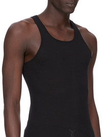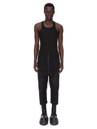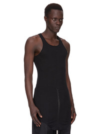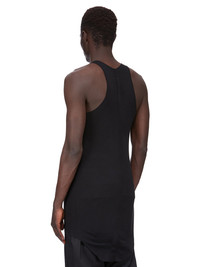 RICK OWENS FOREVER BASIC RIB TANK IN BLACK MINI RIB JERSEY THIS BASIC RIB TANK IS HIP LENGTH WITH A ROUNDED RAW CUT HEM THAT DIPS IN FRONT AND BACK. IT HAS A ROUND NECKLINE AND THIN SHOULDER STRAPS THAT FLOW INTO A SLIGHT RACER BACK. IT FEATURES THE SIGNATURE SINGLE SEAM RUNNING DOWN THE CENTRE BACK SPINE THIS LIGHTWEIGHT MINI RIB JERSEY HAS A TEXTURED SURFACE AND SOFT HANDFEEL. THIS JERSEY IS MADE USING GOTS CERTIFIED ORGANIC COTTON WHICH MEANS THE NATURAL FIBER IS GROWN WITHOUT HARMFUL CHEMICALS, LEAVING OUR SOIL, AIR AND WATER CLEANER FROM CONTAMINATES WE STRIVE TO KEEP OUR PRODUCTION AS LOCAL AS POSSIBLE. THE FULL MANUFACTURING CYCLE OF THIS PRODUCT, FROM THE MATERIAL KNITTING TO SEWING AND FINISHING, WAS UNDERTAKEN CLOSE TO OUR HOME BASE IN CONCORDIA, ITALY. - COLOR:BLACK - MATERIAL: 100% COTTON - MODEL IS WEARING SIZE S - MODEL IS 189 CM TALL