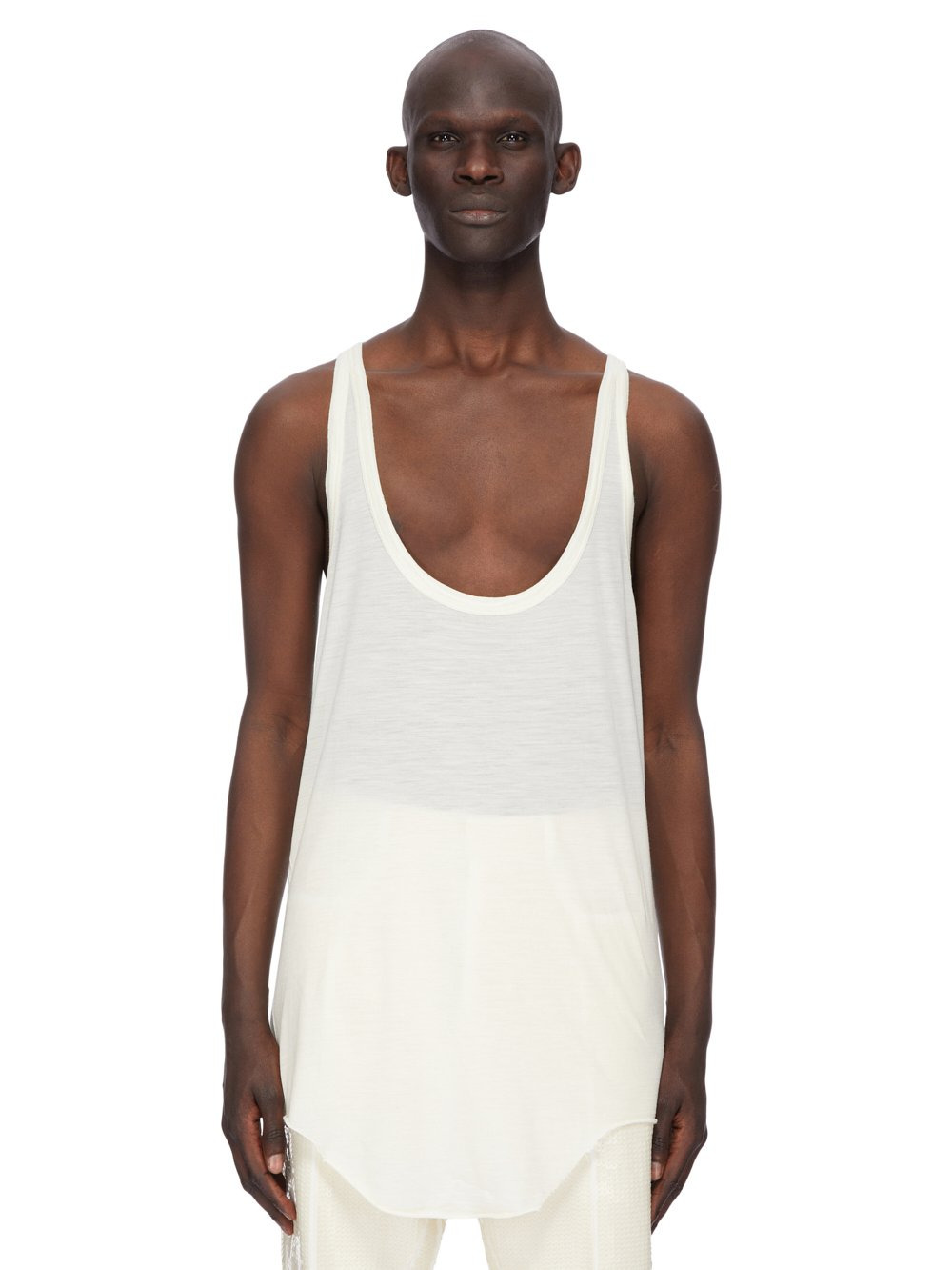 RICK OWENS FW25 CONCORDIANS RUNWAY PONY TANK IN NATURAL SILK WOOL JERSEY THIS PONY TANK IS BELOW HIP LENGTH. IT HAS A LOW SCOOP FRONT, A SLIGHT RACER BACK AND A ROUNDED RAW CUT HEM THAT DIPS IN FRONT AND BACK. THIS LIGHTWEIGHT SILK AND WOOL BLEND JERSEY HAS A SOFT HANDFEEL AND SEMI SHINY SURFACE THIS JERSEY IS MADE FROM RWS CERTIFIED VIRGIN WOOL WHICH ENSURES A HIGH STANDARD IN ANIMAL WELFARE, ENVIRONMENTAL SUSTAINABILITY AND SOCIAL RESPONSIBILITY. EACH BALE OF WOOL IS TRACEABLE BACK TO ITS SOURCE WE STRIVE TO KEEP OUR PRODUCTION AS LOCAL AS POSSIBLE. THE FULL MANUFACTURING CYCLE OF THIS PRODUCT, FROM THE MATERIAL KNITTING TO SEWING AND FINISHING, WAS UNDERTAKEN CLOSE TO OUR HOME BASE IN CONCORDIA, ITALY COLOR: NATURAL MATERIAL: 70% NEW WOOL + 30% SILK MODEL IS 189CM TALL MODEL WEARS SIZE S