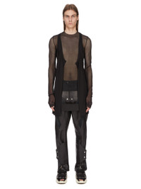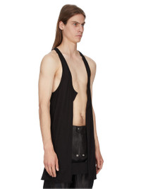 RICK OWENS SS26 TEMPLE OPEN PONY TANK IN BLACK COTTON GAUZE JERSEY THIS FRONT OPEN PONY TANK IS BELOW HIP LENGTH. IT HAS A LOW SCOOP FRONT, A SLIGHT RACER BACK AND A ROUNDED RAW CUT HEM THAT DIPS IN FRONT AND BACK. THIS VERSION IS HAND CUT UP THE FRONT REVEALING THE BODY THIS LIGHTWEIGHT AND AIRY COTTON GAUZE JERSEY IS SEMI TRANSPARENT AND HAVE A SOFT WASHED HAND FEEL. THIS JERSEY IS GARMENT DYED THIS FABRIC IS MADE USING GOTS CERTIFIED ORGANIC COTTON WHICH MEANS THE NATURAL FIBER IS GROWN WITHOUT HARMFUL CHEMICALS, LEAVING OUR SOIL, AIR AND WATER CLEANER FROM CONTAMINATES COLOR: BLACK MATERIAL:100% COTTON MODEL IS 189CM TALL MODEL WEARS SIZE S