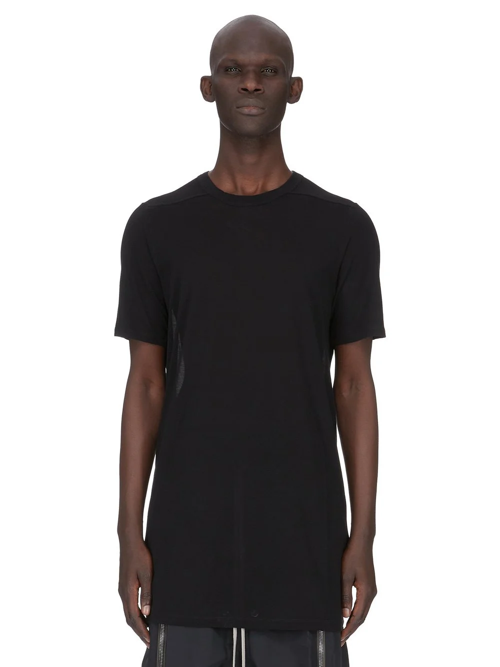 RICK OWENS SS26 TEMPLE LEVEL T IN BLACK VISCOSE SILK JERSEY THIS LEVEL T IS HIP LENGTH WITH SHORT SLEEVES AND A RIBBED ROUND CREWNECK. IT FEATURES THE SIGNATURE LEVEL SHOULDER SEAMS AND SINGLE SEAM RUNNING DOWN THE CENTER BACK SPINE. THIS LIGHTWEIGHT AND FLUID VISCOSE AND SILK JERSEY HAS A SOFT HANDFEEL. THIS FABRIC IS MADE FROM FSC® CERTIFIED (FSC – C162846) ACETATE WHICH ENSURES THAT THE FIBERS ARE PRODUCED FROM RESPONSIBLY MANAGED SOURCES AND NO DEFORESTATION OCCURS. WE STRIVE TO KEEP OUR PRODUCTION AS LOCAL AS POSSIBLE. THE FULL MANUFATURING CYCLE OF THIS PRODUCT, FROM THE MATERIAL KNITTING TO SEWING AND FINISHING, WAS UNDERTAKEN CLOSE TO OUR HOME BASE IN CONCORDIA, ITALY. COLOR: BLACK MATERIAL:88% VISCOSE + 12% SILK MODEL IS 189CM TALL MODEL WEARS SIZE S