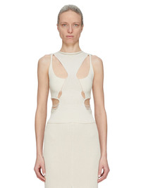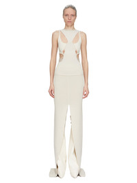 RICK OWENS FW25 CONCORDIANS RUNWAY TANJA TOP IN NATURAL WOOL THIS TANJA TOP IS HIP LENGTH. IT HAS A ROLLED ROUND NECK AND IS SLEEVELESS. IT FEATURES CUT-OUTS ON FRONT CHEST, LOW BUST AND WAIST, WITH A SLIGHTLY SHREDDED SIDE AND A FULL BACK COLOR: NATURAL MATERIAL: 100% NEW WOOL DETAIL 48% ALPACA + 30% NYLON + 20% WOOL + 2% ELASTANE MODEL IS 181CM TALL MODEL WEARS SIZE S
