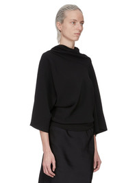 RICK OWENS FW25 CONCORDIANS CYLINDER TOP IN BLACK HEAVY CADY THIS CYLINDER TOP IS HIP-LENGTH, WITH A DRAPED BIAS CUT BODY, ELBOW-LENGTH WIDE SLEEVES AND A HIGH DRAPED COWL NECK THAT HAS AN ASYMMETRICAL OPENING AT BACK. IT GATHERS INTO THE WAIST AND FINISHES IN A TIGHT BODY TO THE HIP THIS MEDIUMWEIGHT CADY CREPE IS FLUID WITH A CRISP SURFACE TEXTURE AND A COOL SLICK BACKSIDE THIS FABRIC IS MADE FROM FSC® CERTIFIED VISCOSE AND ACETATE WHICH ENSURES THAT THE FIBERS ARE PRODUCED FROM RESPONSIBLY MANAGED SOURCES AND NO DEFORESTATION OCCURS COLOR: BLACK MATERIAL: 53% VISCOSE + 47% ACETATE BOTTOM 100% COTTON MODEL IS 181CM TALL MODEL WEARS SIZE 40