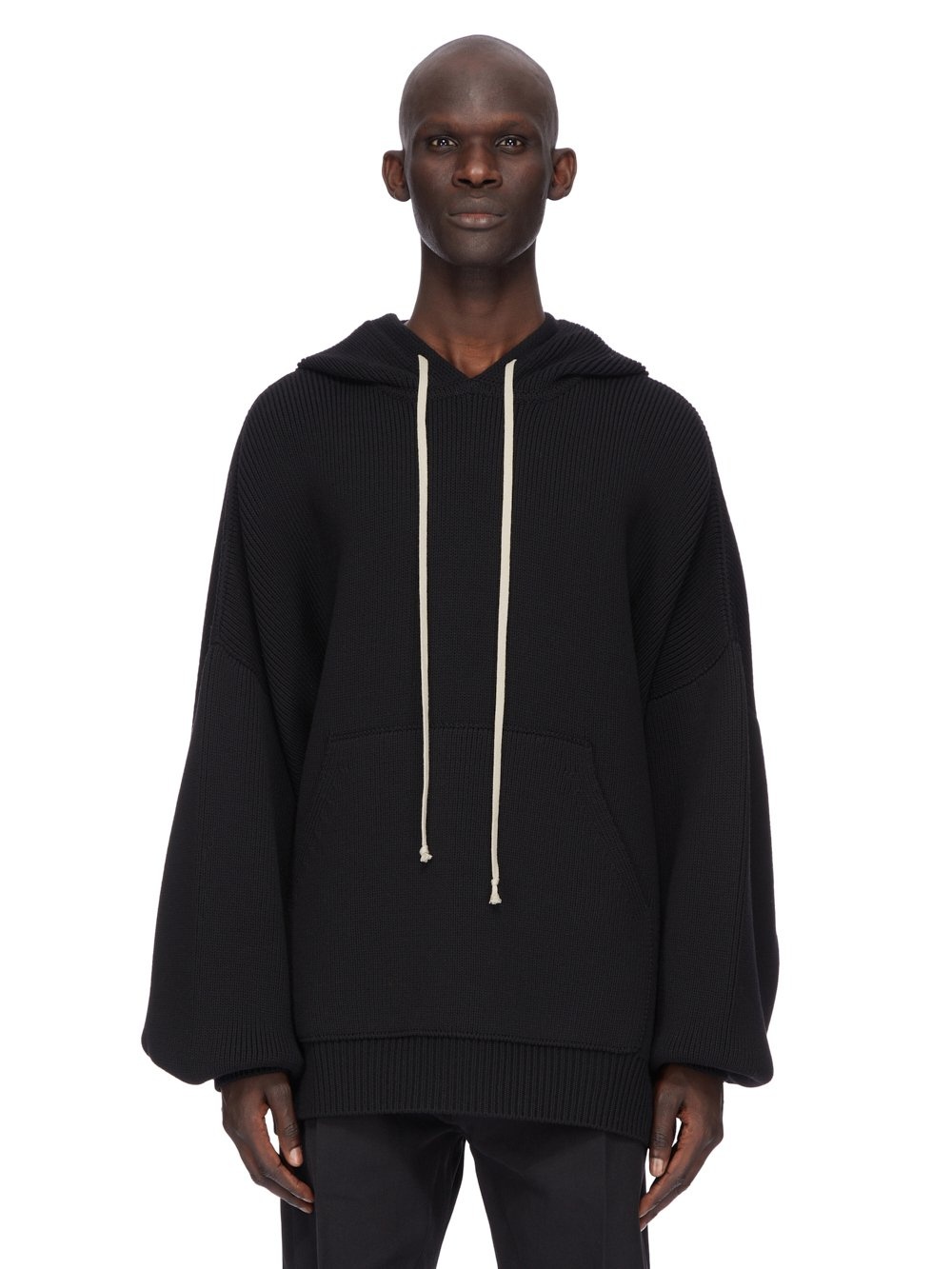 RICK OWENS FW25 CONCORDIANS RUNWAY HUN HOODIE IN BLACK WOOL THIS HUN HOODIE IS BELOW HIP LENGTH WITH LONG, WIDE SLEEVES WITH LOW SHOULDERS AND AN OVERSIZED FIT. IT HAS A BIG HOOD WITH DRAWSTRINGS, A BIG FRONT POCKET WITH OPENINGS ON EACH SIDE. IT HAS RIBBED CUFFS AND HEM, AND A SINGLE CHANNEL RUNNING DOWN THE CENTRE BACK SPINE. COLOR: BLACK MATERIAL: 100% NEW WOOL MODEL IS 189CM TALL MODEL WEARS SIZE L