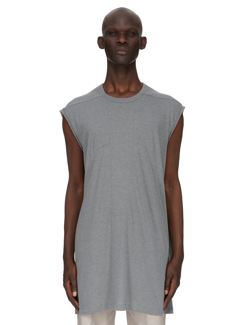 RICK OWENS FW25 CONCORDIANS SPLINTERED TARP T IN WASHED INDIGO RAININO JERSEY THIS TARP T IS BELOW HIP LENGTH WITH A LOOSE FIT. IT IS SLEEVELESS WITH WIDE SHOULDERS AND A RIBBED CREW NECK. IT HAS SIGNATURE FRONT LEVEL SHOULDER SEAMS AND SINGLE SEAM RUNNING DOWN THE CENTRE BACK SPINE THIS MEDIUMWEIGHT AND FLUID VISCOSE AND WOOL BLEND JERSEY HAS A SOFT, WARM HANDFEEL AND A SLIGHTLY HAIRY SURFACE TEXTURE WE STRIVE TO KEEP OUR PRODUCTION AS LOCAL AS POSSIBLE. THE FULL MANUFACTURING CYCLE OF THIS PRODUCT, FROM THE MATERIAL KNITTING TO SEWING AND FINISHING, WAS UNDERTAKEN CLOSE TO OUR HOME BASE IN CONCORDIA, ITALY THIS JERSEY IS MADE FROM FSC® CERTIFIED VISCOSE AND RWS CERTIFIED WOOL COLOR: WASHED INDIGO MATERIAL: 30% VISCOSE + 30% NYLON + 20% ANGORA + 20% WOOL MODEL IS 189CM TALL MODEL WEARS SIZE S