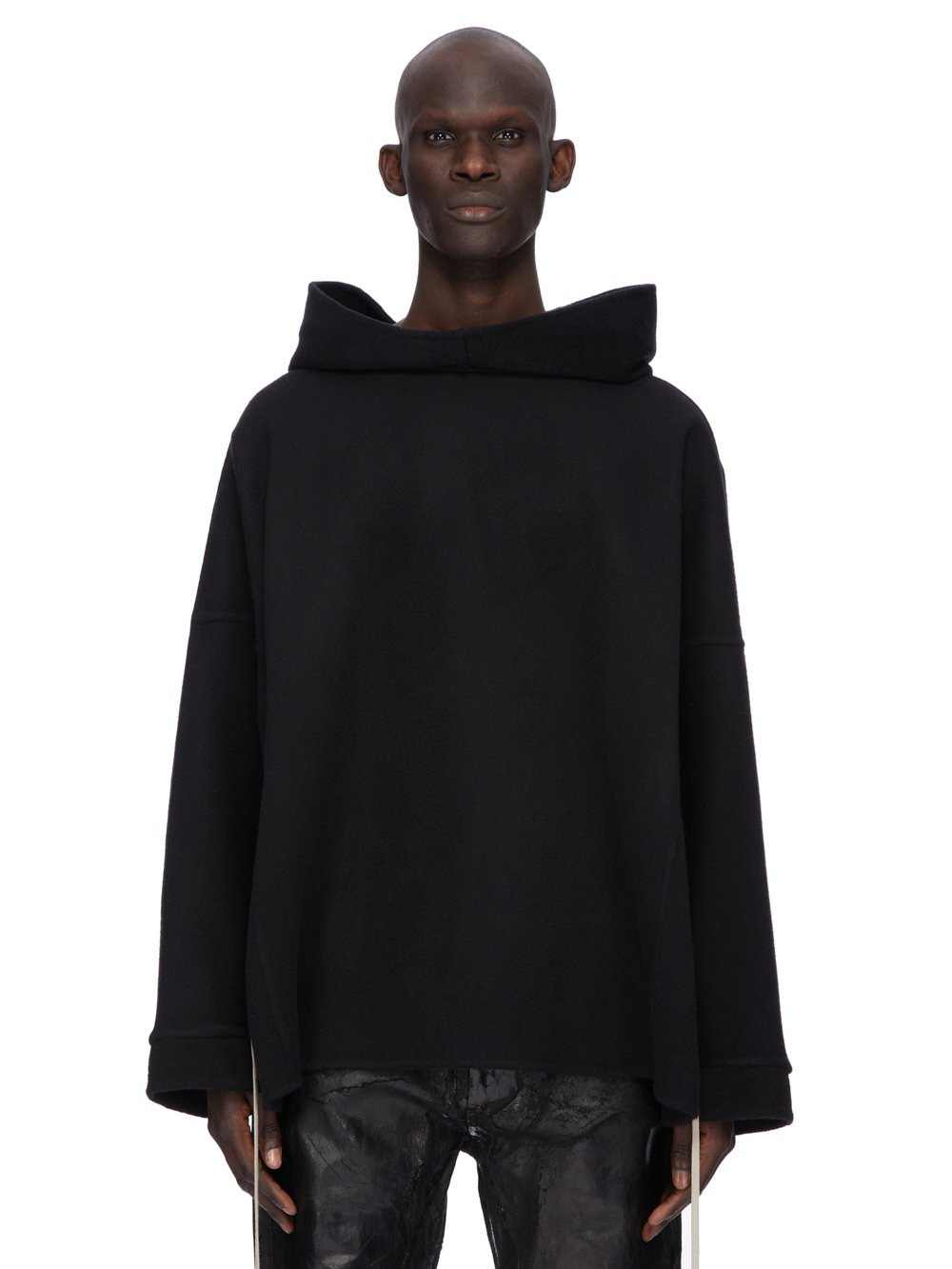 RICK OWENS FW25 CONCORDIANS RUNWAY HOODED TUNIC IN BLACK VICUNA THIS HOODED TUNIC IS HIP LENGTH WITH LONG SLEEVES. IT HAS A LARGE HOOD THAT DRAPES AT THE FRONT NECK, AND A WIDE SQUARE BODY COLOR: BLACK MATERIAL: 100% VICUNA MODEL IS 189CM TALL ITEM IS AVAILABLE IN ONE SIZE
