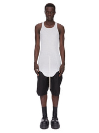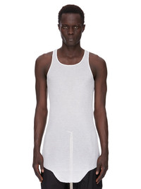 RICK OWENS FOREVER BASIC RIB TANK IN MILK MINI RIB JERSEY THIS BASIC RIB TANK IS HIP LENGTH WITH A ROUNDED RAW CUT HEM THAT DIPS IN FRONT AND BACK. IT HAS A ROUND NECKLINE AND THIN SHOULDER STRAPS THAT FLOW INTO A SLIGHT RACER BACK. IT FEATURES THE SIGNATURE SINGLE SEAM RUNNING DOWN THE CENTRE BACK SPINE. THIS LIGHTWEIGHT MINI RIB JERSEY HAS A TEXTURED SURFACE AND SOFT HANDFEEL. THIS JERSEY IS MADE USING GOTS CERTIFIED ORGANIC COTTON WHICH MEANS THE NATURAL FIBER IS GROWN WITHOUT HARMFUL CHEMICALS, LEAVING OUR SOIL, AIR AND WATER CLEANER FROM CONTAMINATES. WE STRIVE TO KEEP OUR PRODUCTION AS LOCAL AS POSSIBLE. THE FULL MANUFACTURING CYCLE OF THIS PRODUCT, FROM THE MATERIAL KNITTING TO SEWING AND FINISHING, WAS UNDERTAKEN CLOSE TO OUR HOME BASE IN CONCORDIA, ITALY. FLAGSHIP STORES AND ONLINE ITEM. COLOR: WHITE MATERIAL: 100% COTTON MODEL IS WEARING SIZE S MODEL IS 189 CM TALL