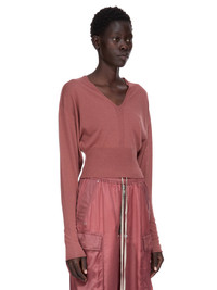 RICK OWENS FW25 CONCORDIANS V CROPPED TOP IN ROSEWOOD LIGHTWEIGHT RASATO KNIT THIS V CROPPED TOP IS WAIST LENGTH WITH A WIDE RIBBED WAISTBAND. IT HAS LONG, WIDE BATWING-LIKE, SLEEVES AND A DEEP V NECK WITH SLIM KNIT EDGE AND FRONT LINE DETAIL. IT FEATURES A SIGNATURE KNIT LINE RUNNING DOWN THE CENTRE BACK SPINE THIS LIGHTWEIGHT AND CLASSIC STITCH WOOL KNIT HAS A SOFT HANDFEEL COLOR: ROSEWOOD MATERIAL: 100% NEW WOOL MODEL IS 181CM TALL MODEL WEARS SIZE S