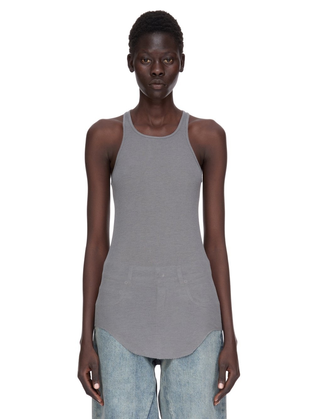 RICK OWENS FW25 CONCORDIANS BASIC RIB TANK IN WASHED INDIGO VISCOSE SILK RIB JERSEY THIS BASIC RIB TANK IS HIP LENGTH WITH A ROUNDED RAW CUT HEM THAT DIPS IN FRONT AND BACK. IT HAS A ROUND NECKLINE AND THIN SHOULDER STRAPS THAT FLOW INTO A SLIGHT RACER BACK. IT FEATURES THE SIGNATURE SINGLE SEAM RUNNING DOWN THE CENTRE BACK SPINE THIS LIGHTWEIGHT VISCOSE AND SILK RIB JERSEY HAS A DISTINCT RIB PATTERN AND SOFT HANDFEEL THIS JERSEY IS MADE FROM FSC® CERTIFIED VISCOSE WHICH ENSURES THAT THE FIBERS ARE PRODUCED FROM RESPONSIBLY MANAGED SOURCES AND NO DEFORESTATION OCCURS WE STRIVE TO KEEP OUR PRODUCTION AS LOCAL AS POSSIBLE. THE FULL MANUFACTURING CYCLE OF THIS PRODUCT, FROM THE MATERIAL KNITTING TO SEWING AND FINISHING, WAS UNDERTAKEN CLOSE TO OUR HOME BASE IN CONCORDIA, ITALY COLOR: WASHED INDIGO MATERIAL: 88% VISCOSE + 12% SILK MODEL IS 181CM TALL MODEL WEARS SIZE 40