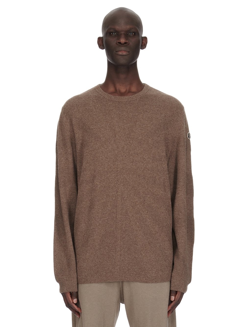 MONCLER + RICK OWENS FW24 JUMBO ROUND NECK IN DUST WOOL-CASHMERE BLEND THIS JUMBO ROUND NECK SWEATER IS BELOW HIP LENGTH WITH A LOOSE FIT. IT HAS A RIBBED ROUND NECK, HEM AND CUFFS. IT FEATURES A SUBTLE RADIANCE JACQUARD KNIT DESIGN WITH LINES RADIATING OUT FROM A KNIT CHANNEL RUNNING DOWN THE CENTRE FRONT AND THE CENTRE BACK SPINE. IT HAS AN EMBROIDERED RICK OWENS + MONCLER PATCH HIGH ON THE LEFT ARM THIS MEDIUMWEIGHT CLASSIC STITCH KNIT HAS A SOFT AND WARM HAND FEEL - COLOR: DUST - MATERIAL: 90% NEW WOOL + 10% CASHMERE - MALE MODEL IS 189 CM TALL, FEMALE MODEL IS 181 CM TALL - MODELS ARE WEARING SIZE M