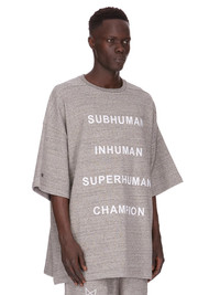CHAMPION X RICK OWENS SS25 TOMMY T IN GREY MELANGE MELANGE FELPA JERSEY IT FEATURES A 3D EMBROIDERED SIGNATURE CHAMPION X RICK OWENS SUBHUMAN, INHUMAN, SUPERHUMAN, CHAMPION LOGO ON FRONT AND CHAMPION LOGO ON RIGHT SLEEVE THIS HEAVYWEIGHT FELPA JERSEY IS KNITTED WITH A MULTICOLOURED SLUB YARN THAT CREATES THE VINTAGE MELANGE EFFECT. IT HAS A SOFT HANDFEEL THIS JERSEY IS MADE USING CERTIFIED ORGANIC COTTON WHICH MEANS THE NATURAL FIBER IS GROWN WITHOUT HARMFUL CHEMICALS, LEAVING OUR SOIL, AIR AND WATER CLEANER FROM CONTAMINATES COLOR: GREY MELANGEMATERIAL: 100% COTTON MODEL WEARS SIZE M MODEL IS 189CM TALL