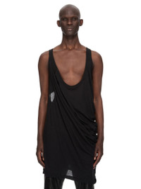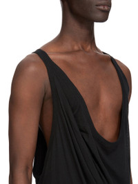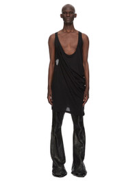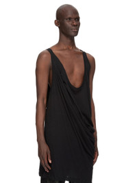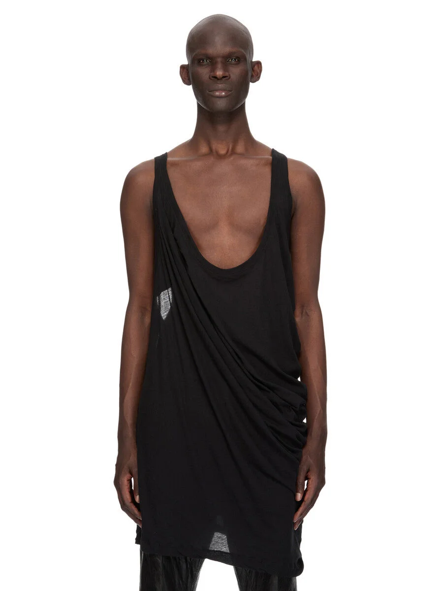 RICK OWENS SS26 TEMPLE PONY TANK IN BLACK UNSTABLE COTTON THIS PONY TANK IS BELOW HIP LENGTH. IT HAS A LOW SCOOP FRONT, A SLIGHT RACER BACK AND A ROUNDED RAW CUT HEM THAT DIPS IN FRONT AND BACK. THIS LIGHTWEIGHT COTTON JERSEY IS SEMI-TRANSPARENT WITH A SOFT HANDFEEL. THIS JERSEY IS MADE USING GOTS CERTIFIED ORGANIC COTTON WHICH MEANS THE NATURAL FIBER IS GROWN WITHOUT HARMFUL CHEMICALS, LEAVING OUR SOIL, AIR AND WATER CLEANER FROM CONTAMINATES. WE STRIVE TO KEEP OUR PRODUCTION AS LOCAL AS POSSIBLE. THE FULL MANUFATURING CYCLE OF THIS PRODUCT, FROM THE MATERIAL KNITTING TO SEWING AND FINISHING, WAS UNDERTAKEN CLOSE TO OUR HOME BASE IN CONCORDIA, ITALY. COLOR: BLACK MATERIAL:100% COTTON MODEL IS 189CM TALL MODEL WEARS SIZE S