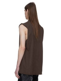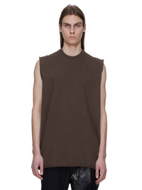 RICK OWENS FW25 CONCORDIANS RUNWAY JUMBO SL T IN DARK DUST COMPACT HEAVY JERSEY THIS JUMBO SL T IS BELOW HIP LENGTH WITH AN OVERSIZED FIT AND SLEEVELESS. IT HAS A RIBBED CREWNECK AND IT FEATURES SIGNATURE FRONT LEVEL SHOULDER SEAMS AND A CENTRE BACK SEAM THIS HEAVYWEIGHT AND COMPACT COTTON JERSEY HAS A BRUSHED AND SOFT HANDFEEL. THIS JERSEY IS GARMENT DYED THIS FABRIC IS MADE USING GOTS CERTIFIED ORGANIC COTTON WHICH MEANS THE NATURAL FIBER IS GROWN WITHOUT HARMFUL CHEMICALS, LEAVING OUR SOIL, AIR AND WATER CLEANER FROM CONTAMINATES COLOR: DARK DUST MATERIAL: 100% COTTON MODEL IS 189CM TALL MODEL WEARS SIZE S