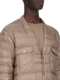 MONCLER + RICK OWENS FW24 OUTERSHIRT IN DUST RECYCLED LONGUE SAISON THIS OUTERSHIRT IS BELOW HIP LENGTH WITH A BOXY FIT. IT HAS A V NECK AND CENTRE FRONT OPENING WITH VISIBLE SNAP CLOSURES AND SNAP CUFFS. IT FEATURES TWO SQUARE CHEST POCKETS WITH BEVELED FLAPS AND SNAPS, SIGNATURE LEVEL SHOULDER SEAMS AND A COTTON WEBBING STRAP WITH RIVET DETAIL ON THE BACK YOKE. IT HAS THE MONCLER + RICK OWENS EMBROIDERED LOGO PATCH ON THE UPPER LEFT ARM THIS AIRY AND LIGHTWEIGHT DUVET MATERIAL IS MADE USING CERTIFIED RECYCLED POLYESTER - COLOR: DUST - MATERIAL: 100% POLYESTER - LINING 100% POLYESTER - PADDING 90% GOOSE DOWN + 10% GOOSE FEATHERS - MALE MODEL IS 189 CM TALL, FEMALE MODEL IS 181 CM TALL - MALE MODEL IS WEARING SIZE 46, FEMALE MODEL IS WEARING SIZE 40
