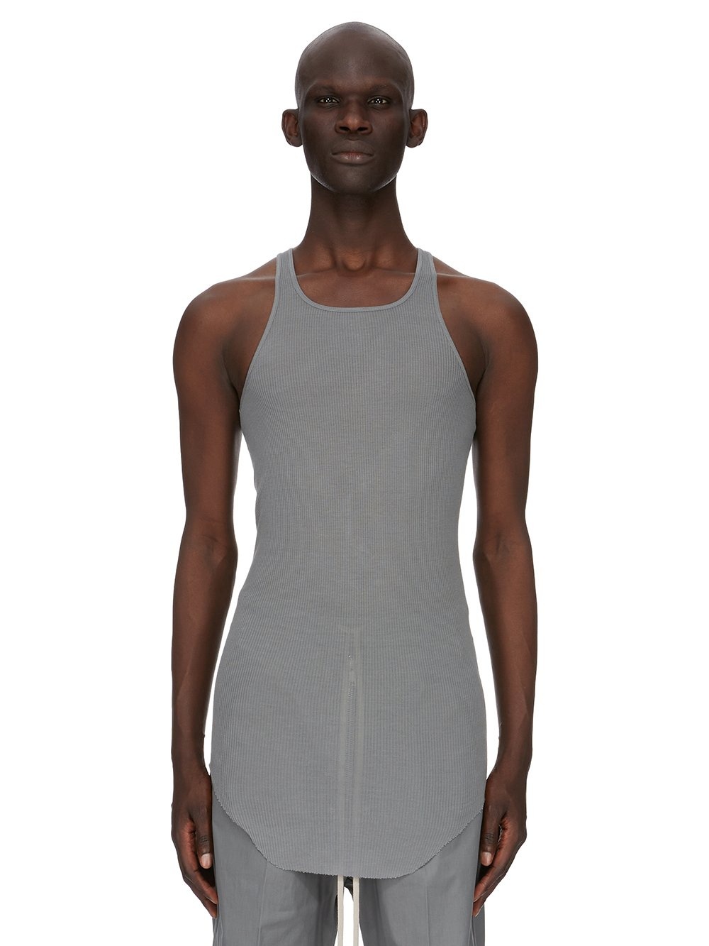 RICK OWENS FW25 CONCORDIANS BASIC RIB TANK IN WASHED INDIGO VISCOSE SILK RIB JERSEY THIS BASIC RIB TANK IS HIP LENGTH WITH A ROUNDED RAW CUT HEM THAT DIPS IN FRONT AND BACK. IT HAS A ROUND NECKLINE AND THIN SHOULDER STRAPS THAT FLOW INTO A SLIGHT RACER BACK. IT FEATURES THE SIGNATURE SINGLE SEAM RUNNING DOWN THE CENTRE BACK SPINE THIS LIGHTWEIGHT VISCOSE AND SILK RIB JERSEY HAS A DISTINCT RIB PATTERN AND SOFT HANDFEEL THIS JERSEY IS MADE FROM FSC® CERTIFIED VISCOSE WHICH ENSURES THAT THE FIBERS ARE PRODUCED FROM RESPONSIBLY MANAGED SOURCES AND NO DEFORESTATION OCCURS WE STRIVE TO KEEP OUR PRODUCTION AS LOCAL AS POSSIBLE. THE FULL MANUFACTURING CYCLE OF THIS PRODUCT, FROM THE MATERIAL KNITTING TO SEWING AND FINISHING, WAS UNDERTAKEN CLOSE TO OUR HOME BASE IN CONCORDIA, ITALY COLOR: WASHED INDIGO MATERIAL: 88% VISCOSE + 12% SILK MODEL IS 189CM TALL MODEL WEARS SIZE S