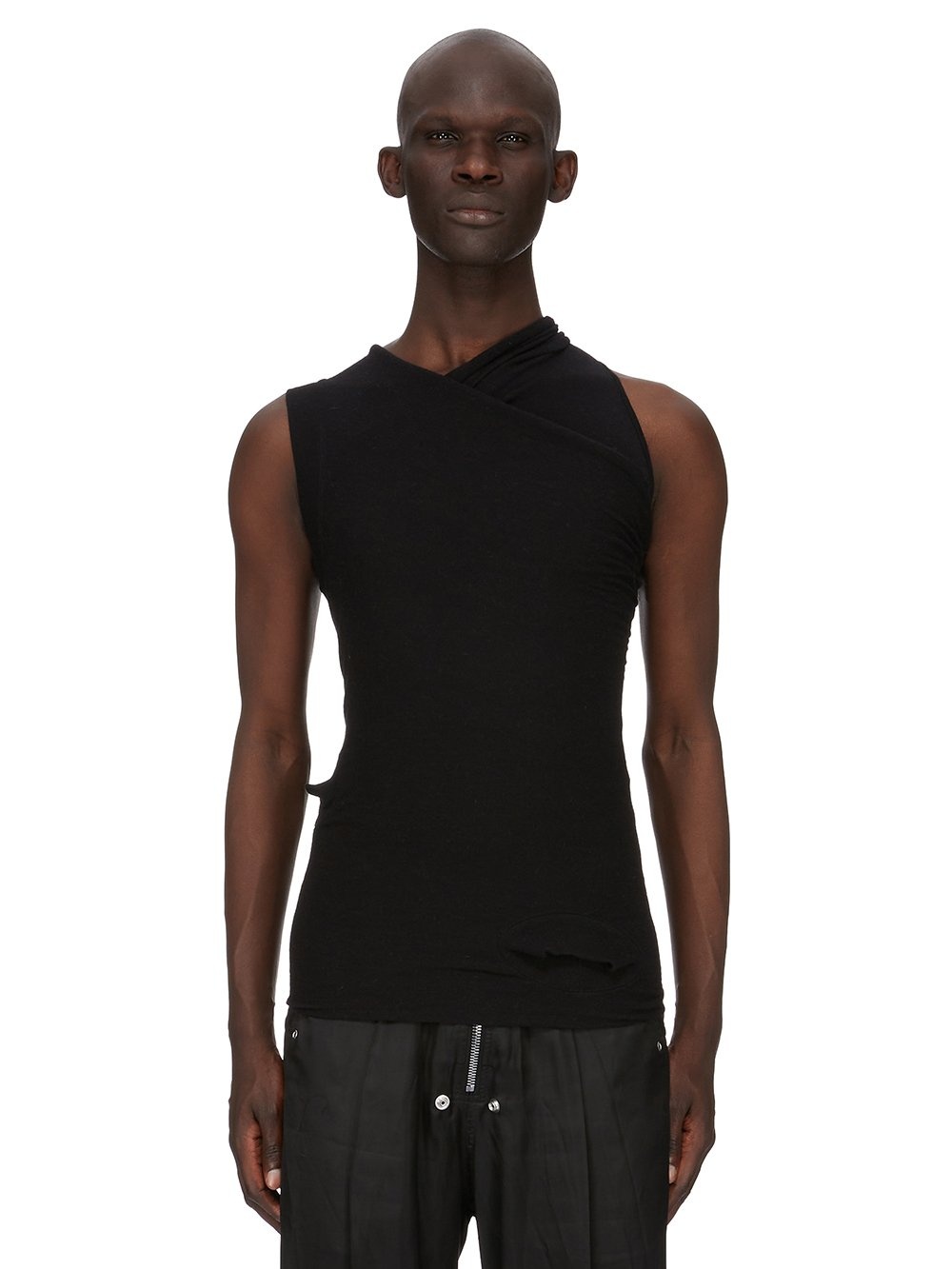 RICK OWENS FW25 CONCORDIANS HOLLYWOOD BANANA T IN BLACK RAININO JERSEY THIS HOLLYWOOD BANANA T IS ABOVE HIP LENGTH AND SLEEVELESS. IT HAS AN UNDER LAYER WITH TWO ROUND HOLES WITH RIB EDGES, AND AN OUTER LAYER THAT FOLDS UP TO CREATE A CRISS CROSS DRAPED NECK FRONT AND BACK THIS MEDIUMWEIGHT AND FLUID VISCOSE AND WOOL BLEND JERSEY HAS A SOFT, WARM HANDFEEL AND A SLIGHTLY HAIRY SURFACE TEXTURE WE STRIVE TO KEEP OUR PRODUCTION AS LOCAL AS POSSIBLE. THE FULL MANUFACTURING CYCLE OF THIS PRODUCT, FROM THE MATERIAL KNITTING TO SEWING AND FINISHING, WAS UNDERTAKEN CLOSE TO OUR HOME BASE IN CONCORDIA, ITALY THIS JERSEY IS MADE FROM FSC® CERTIFIED VISCOSE AND RWS CERTIFIED WOOL COLOR: BLACK MATERIAL: 30% VISCOSE + 30% NYLON + 20% ANGORA + 20% WOOL MODEL IS 189CM TALL MODEL WEARS SIZE S