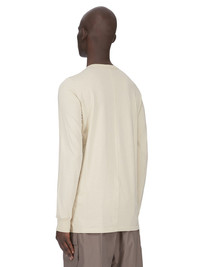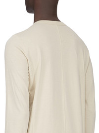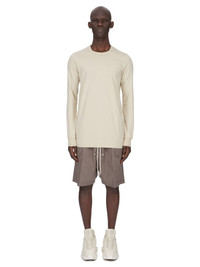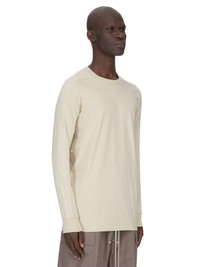 RICK OWENS SS26 TEMPLE LEVEL LS T IN SAND CLASSIC COTTON JERSEY THIS LEVEL LS T IS BELOW-HIP LENGTH WITH LONG SLEEVES. IT HAS A RIBBED ROUND NECK AND CUFFS. IT FEATURES THE SIGNATURE LEVEL SHOULDER SEAMS AND SINGLE SEAM RUNNING DOWN THE CENTER BACK SPINE. THIS MEDIUMWEIGHT CLASSIC COTTON JERSEY IS COMPACT WITH A DRY HANDFEEL. THIS JERSEY IS MADE USING GOTS CERTIFIED ORGANIC COTTON WHICH MEANS THE NATURAL FIBER IS GROWN WITHOUT HARMFUL CHEMICALS, LEAVING OUR SOIL, AIR AND WATER CLEANER FROM CONTAMINATES. WE STRIVE TO KEEP OUR PRODUCTION AS LOCAL AS POSSIBLE. THE FULL MANUFATURING CYCLE OF THIS PRODUCT, FROM THE MATERIAL KNITTING TO SEWING AND FINISHING, WAS UNDERTAKEN CLOSE TO OUR HOME BASE IN CONCORDIA, ITALY. COLOR: SAND MATERIAL:100% COTTON MODEL IS 189CM TALL MODEL WEARS SIZE S