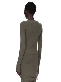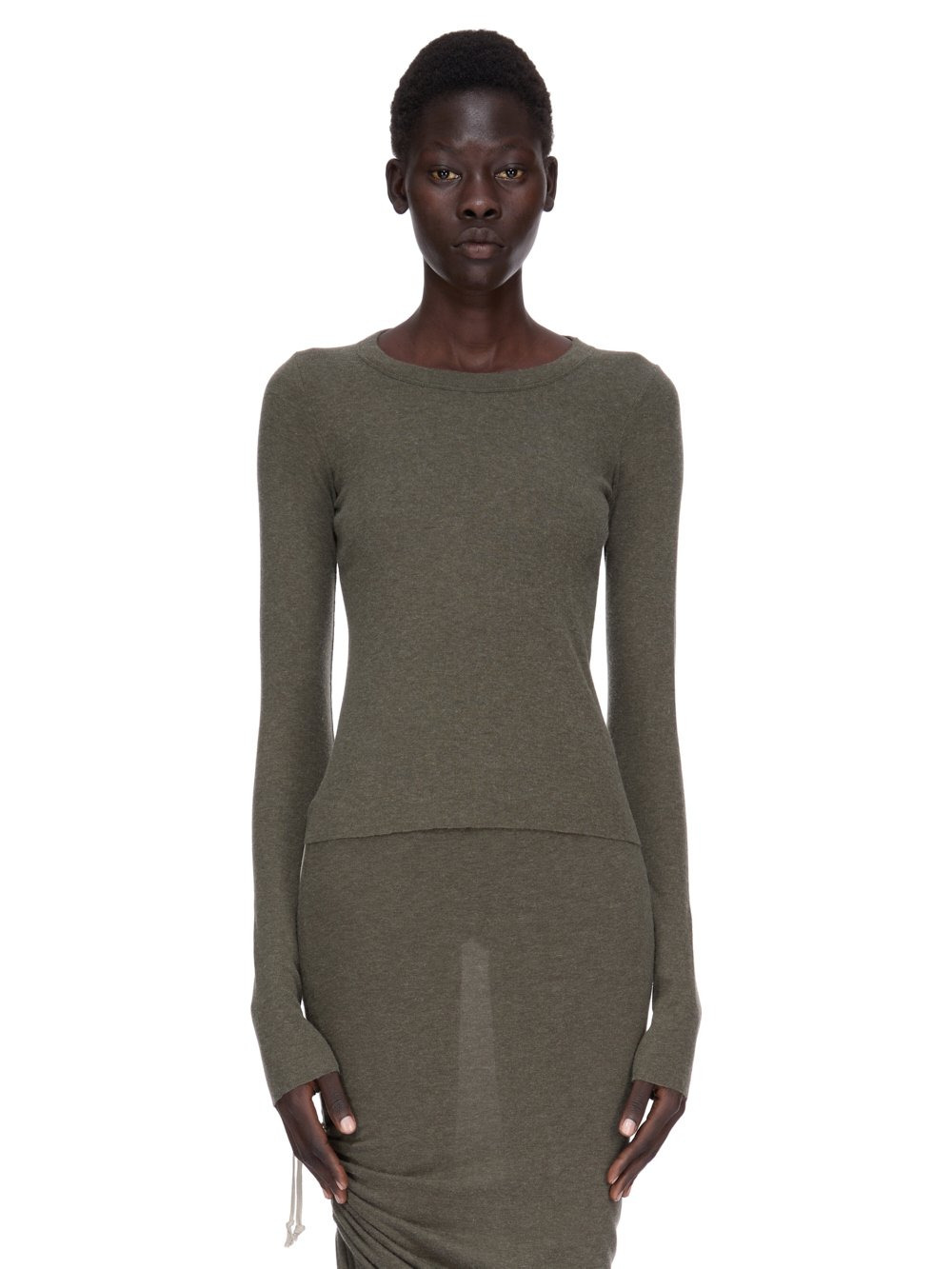 RICK OWENS FW25 CONCORDIANS CROPPED RIB LS T IN BOSCO RAININO RIB JERSEY THIS CROPPED RIB LS T IS ABOVE HIP LENGTH WITH A SLIM FIT AND LONG SLEEVES. IT HAS A RIBBED ROUND NECK, RAW CUT HEM AND CUFFS, AND FEATURES THE SIGNATURE SINGLE SEAM RUNNING DOWN CENTRE BACK SPINE THIS MEDIUMWEIGHT AND FLUID VISCOSE AND WOOL BLEND RIB JERSEY HAS A SOFT, WARM HANDFEEL AND A SLIGHTLY HAIRY SURFACE TEXTURE WE STRIVE TO KEEP OUR PRODUCTION AS LOCAL AS POSSIBLE. THE FULL MANUFACTURING CYCLE OF THIS PRODUCT, FROM THE MATERIAL KNITTING TO SEWING AND FINISHING, WAS UNDERTAKEN CLOSE TO OUR HOME BASE IN CONCORDIA, ITALY THIS JERSEY IS MADE FROM FSC® CERTIFIED VISCOSE AND RWS CERTIFIED WOOL COLOR: BOSCO MATERIAL: 30% VISCOSE + 30% NYLON + 20% ANGORA + 20% WOOL MODEL IS 181CM TALL MODEL WEARS SIZE 40