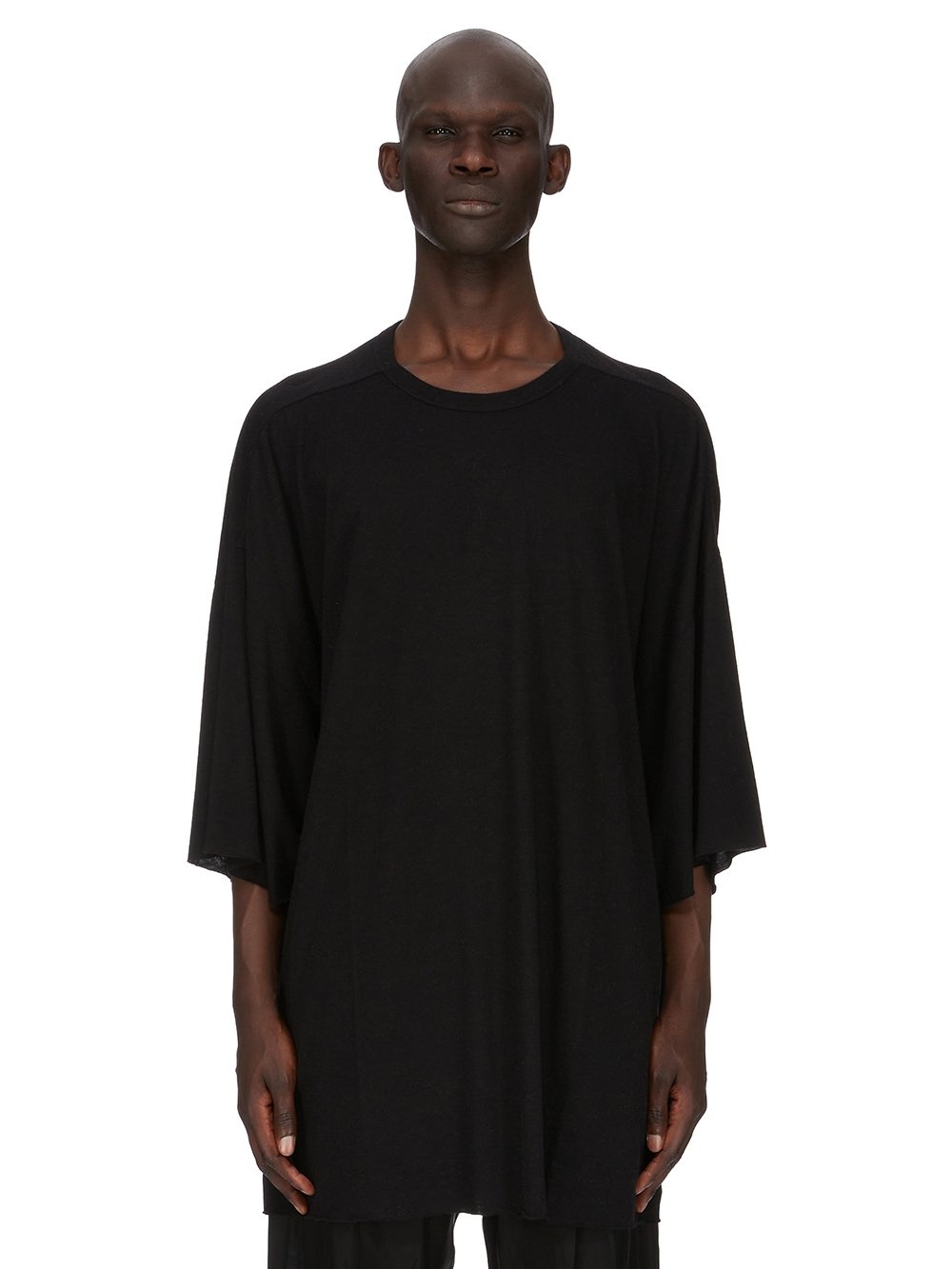 RICK OWENS FW25 CONCORDIANS TOMMY T IN BLACK RAININO JERSEY THIS TOMMY T IS BELOW HIP LENGTH WITH A JUMBO OVERSIZED FIT. IT HAS WIDE SHORT SLEEVES WITH A DROPPED ARMHOLE AND A RIBBED CREWNECK. IT FEATURES SIGNATURE FRONT LEVEL SHOULDER SEAMS THIS MEDIUMWEIGHT AND FLUID VISCOSE AND WOOL BLEND JERSEY HAS A SOFT, WARM HANDFEEL AND A SLIGHTLY HAIRY SURFACE TEXTURE WE STRIVE TO KEEP OUR PRODUCTION AS LOCAL AS POSSIBLE. THE FULL MANUFACTURING CYCLE OF THIS PRODUCT, FROM THE MATERIAL KNITTING TO SEWING AND FINISHING, WAS UNDERTAKEN CLOSE TO OUR HOME BASE IN CONCORDIA, ITALY THIS JERSEY IS MADE FROM FSC® CERTIFIED VISCOSE AND RWS CERTIFIED WOOL COLOR: BLACK MATERIAL: 30% VISCOSE + 30% NYLON + 20% ANGORA + 20% WOOL MODEL IS 189CM TALL ITEM IS AVAILABLE IN ONE SIZE