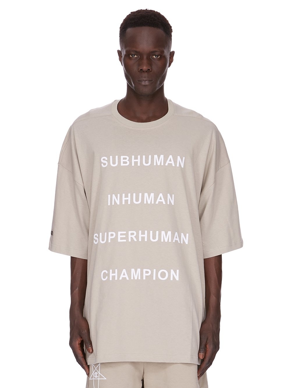 CHAMPION X RICK OWENS SS25 TOMMY T IN PEARL COTTON JERSEY IT FEATURES A 3D EMBROIDERED SIGNATURE CHAMPION X RICK OWENS SUBHUMAN, INHUMAN, SUPERHUMAN, CHAMPION LOGO ON FRONT AND CHAMPION LOGO ON RIGHT SLEEVE THIS MEDIUMWEIGHT CLASSIC COTTON JERSEY IS COMPACT WITH A DRY HANDFEEL THIS JERSEY IS MADE USING CERTIFIED ORGANIC COTTON WHICH MEANS THE NATURAL FIBER IS GROWN WITHOUT HARMFUL CHEMICALS, LEAVING OUR SOIL, AIR AND WATER CLEANER FROM CONTAMINATES COLOR: PEARL MATERIAL: 100% COTTON MODEL WEARS SIZE M MODEL IS 189CM TALL
