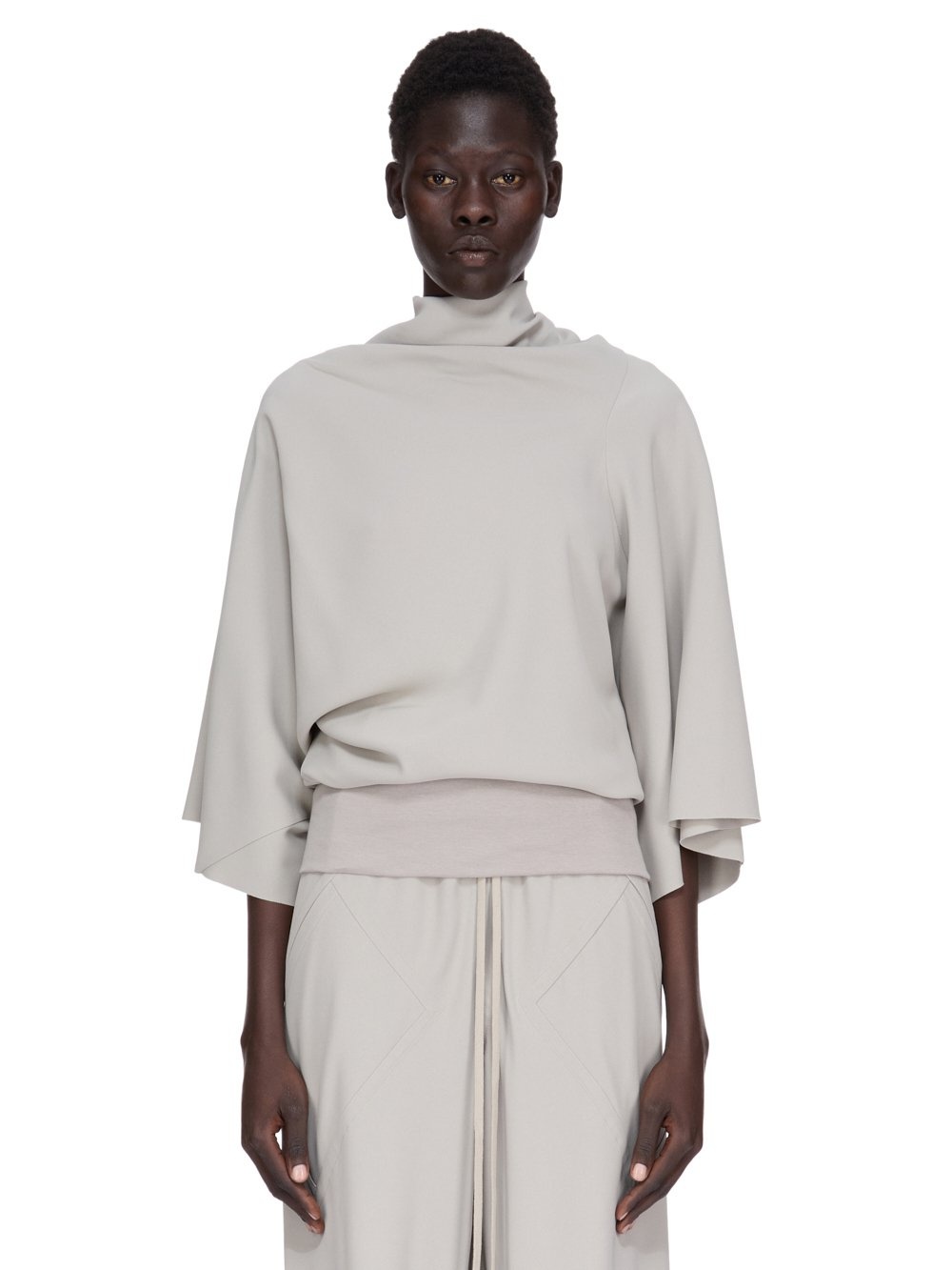 RICK OWENS FW25 CONCORDIANS CYLINDER TOP IN PEARL HEAVY CADY THIS CYLINDER TOP IS HIP-LENGTH, WITH A DRAPED BIAS CUT BODY, ELBOW-LENGTH WIDE SLEEVES AND A HIGH DRAPED COWL NECK THAT HAS AN ASYMMETRICAL OPENING AT BACK. IT GATHERS INTO THE WAIST AND FINISHES IN A TIGHT BODY TO THE HIP THIS MEDIUMWEIGHT CADY CREPE IS FLUID WITH A CRISP SURFACE TEXTURE AND A COOL SLICK BACKSIDE THIS FABRIC IS MADE FROM FSC® CERTIFIED VISCOSE AND ACETATE WHICH ENSURES THAT THE FIBERS ARE PRODUCED FROM RESPONSIBLY MANAGED SOURCES AND NO DEFORESTATION OCCURS COLOR: PEARL MATERIAL: 53% VISCOSE + 47% ACETATE BOTTOM 100% COTTON MODEL IS 181CM TALL MODEL WEARS SIZE 40
