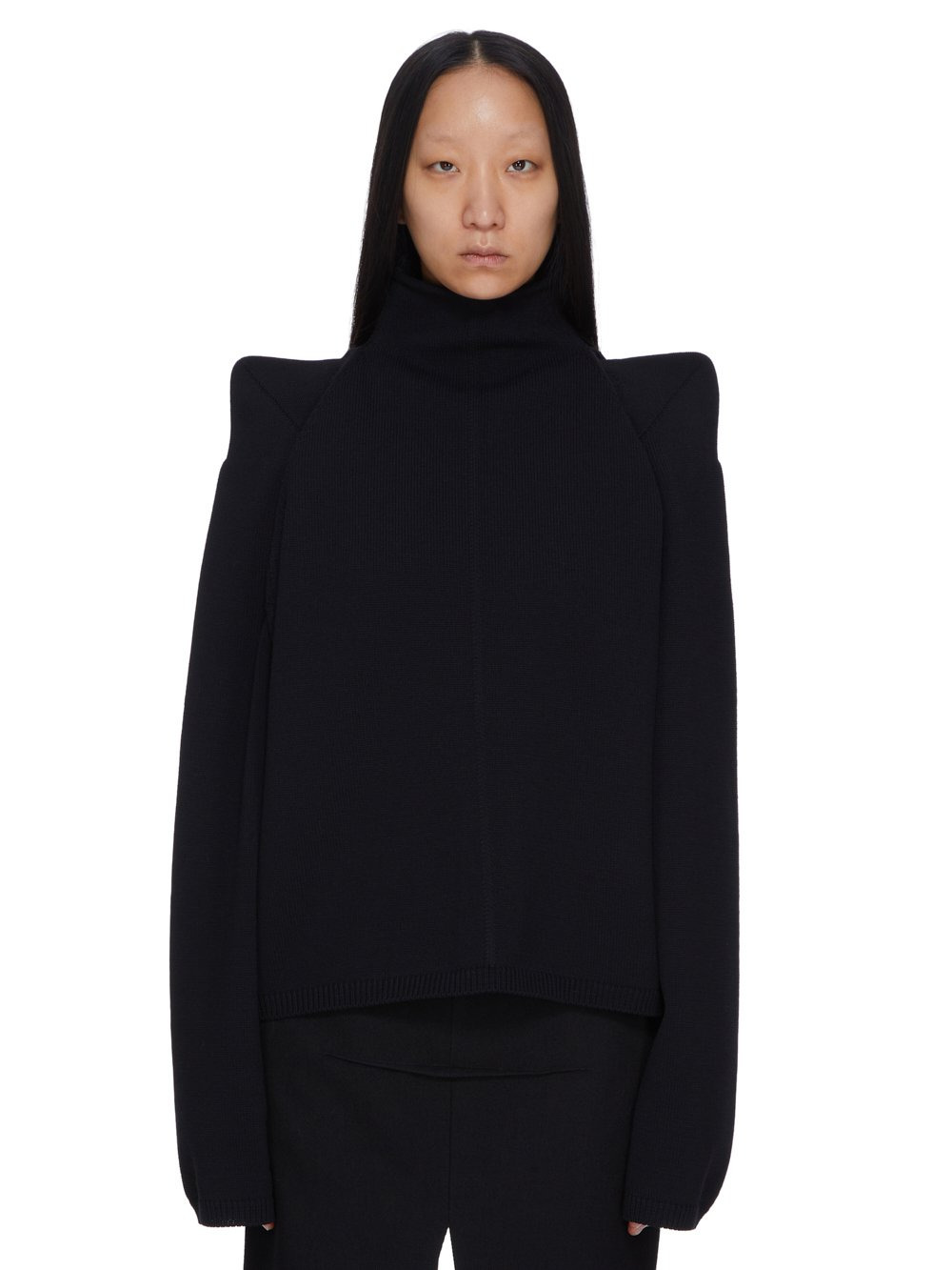 RICK OWENS FW25 CONCORDIANS RUNWAY CON TOP IN BLACK WOOL THIS CON TOP IS HIP LENGTH WITH A BOXY FIT. IT FEATURES LONG, WIDE, SLEEVES AND FIRMLY SHAPED SHOULDERS AND A SLIGHT FUNNEL NECK. IT HAS A CENTRE FRONT SEAM LINE AND A SIGNATURE KNIT CHANNEL RUNNING DOWN THE SPINE. COLOR: BLACK MATERIAL: 100% NEW WOOL MODEL IS 181CM TALL MODEL WEARS SIZE S